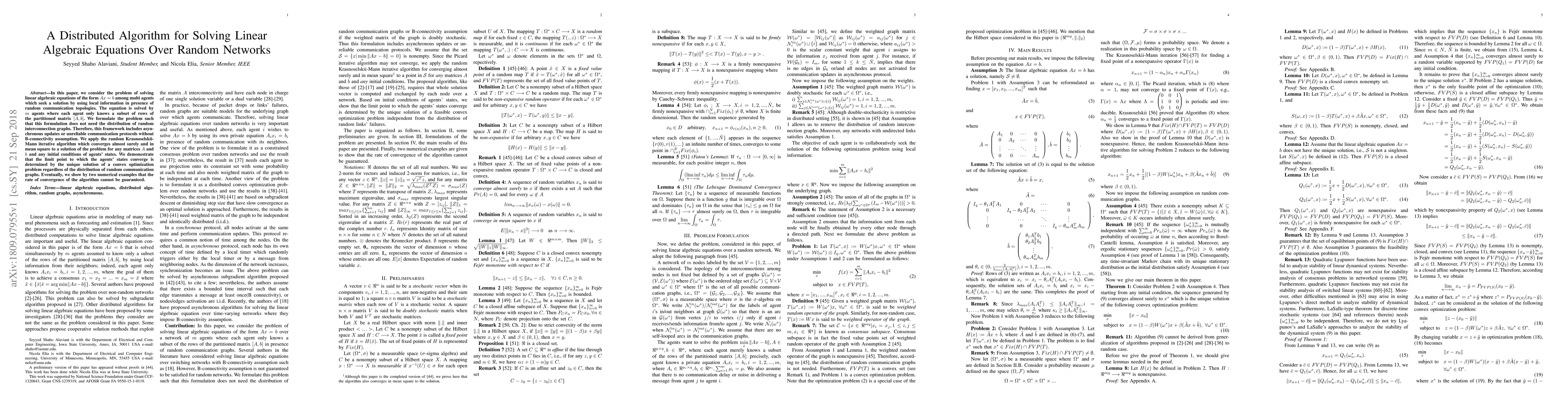 This paper proposes a distributed algorithm for solving linear algebraic equations over random networks, where agents use local information to converge to a solution without requiring specific communication assumptions. The algorithm leverages the Krasnoselskii-Mann iterative method, which guarantees convergence almost surely and in mean square, but does not ensure a guaranteed rate of convergence.