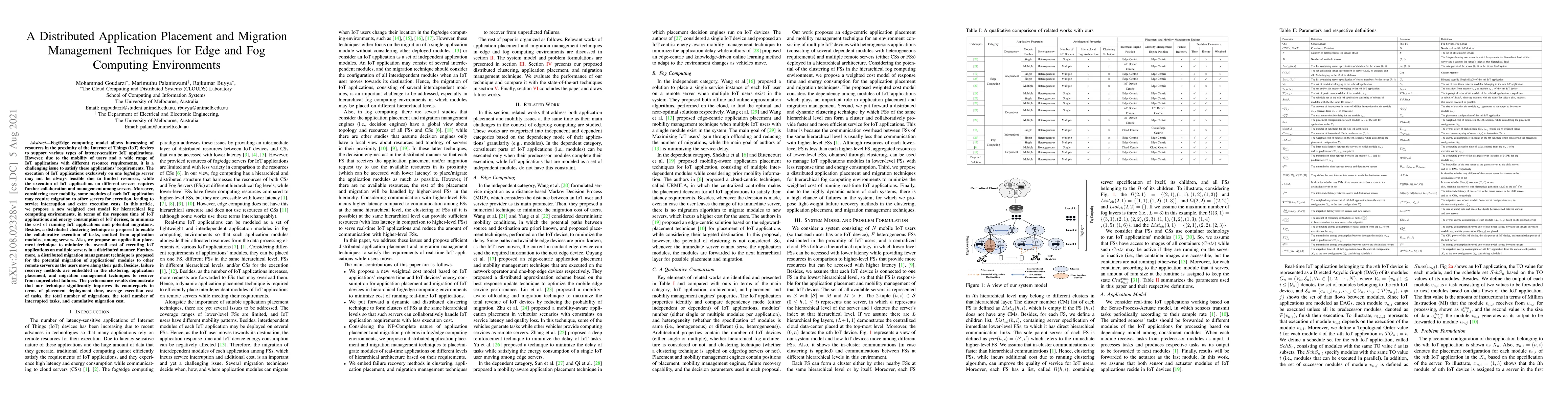 This paper proposes a weighted cost model for managing application placement and migration in edge and fog computing environments to optimize IoT applications' performance. It introduces distributed clustering, application placement, and migration management techniques to minimize execution costs and migrations while ensuring task continuity and failure recovery.