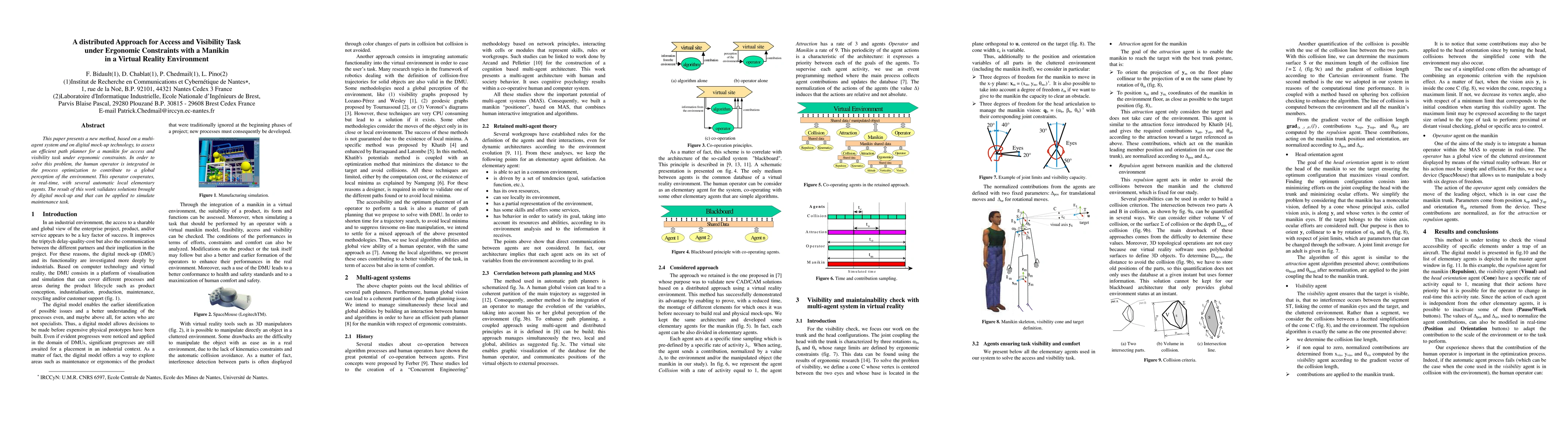 This paper presents a new method, based on a multi-agent system and on digital mock-up technology, to assess an efficient path planner for a manikin for access and visibility task under ergonomic constraints. In order to solve this problem, the human operator is integrated in the process optimization to contribute to a global perception of the environment. This operator cooperates, in real-time, with several automatic local elementary agents. The result of this work validates solutions brought by digital mock-up and that can be applied to simulate maintenance task.