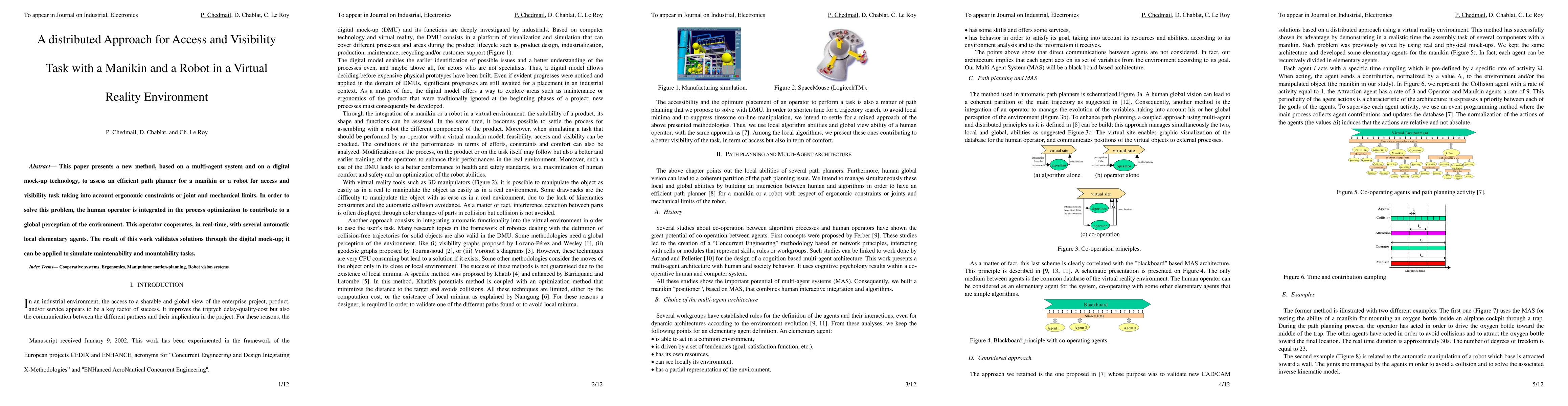 This paper presents a new method, based on a multi-agent system and on a digital mock-up technology, to assess an efficient path planner for a manikin or a robot for access and visibility task taking into account ergonomic constraints or joint and mechanical limits. In order to solve this problem, the human operator is integrated in the process optimization to contribute to a global perception of the environment. This operator cooperates, in real-time, with several automatic local elementary agents. The result of this work validates solutions through the digital mock-up; it can be applied to simulate maintenability and mountability tasks.