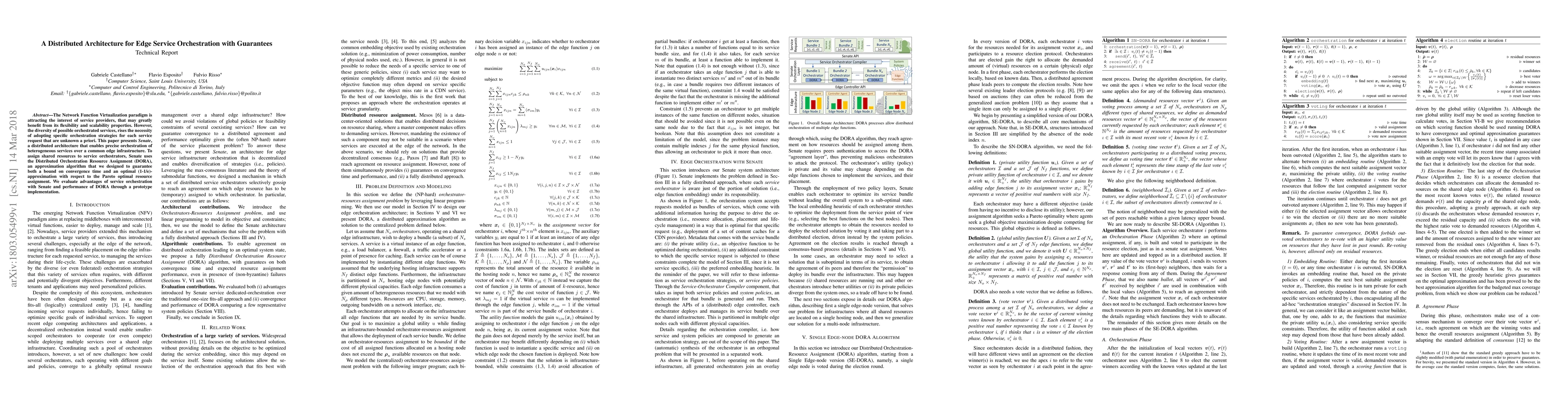 This paper introduces Senate, a distributed architecture for orchestrating heterogeneous services over edge infrastructure, employing a novel DORA algorithm to guarantee convergence time and near-optimal resource allocation. The prototype implementation demonstrates the effectiveness of Senate's orchestration strategies.