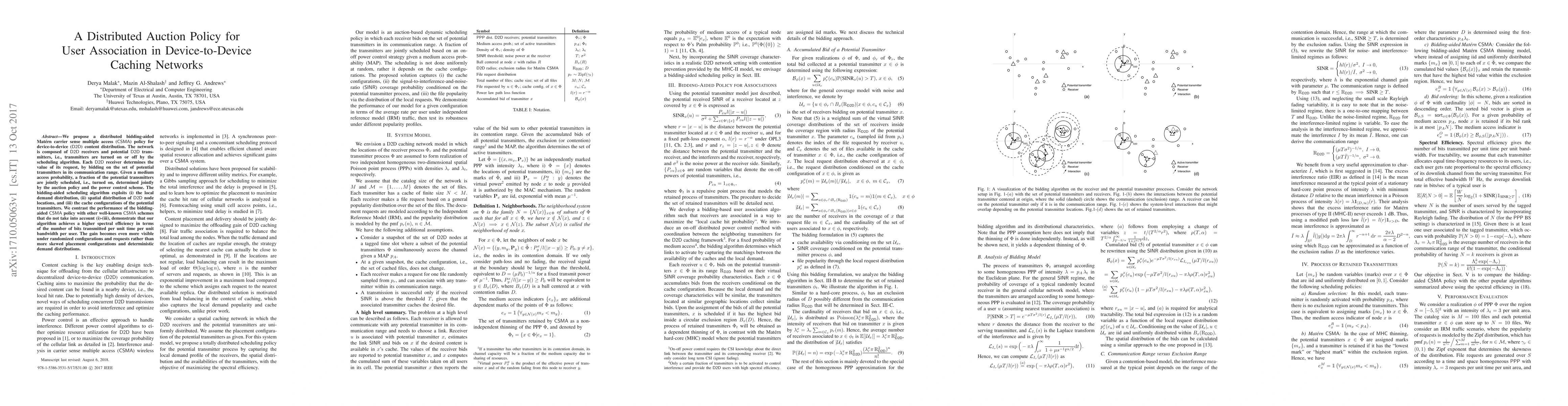 This paper proposes a distributed auction-based CSMA policy for D2D caching networks, where D2D receivers bid to determine the value of their requests. The algorithm leverages local demand, spatial distribution, and cache configurations to enhance spectral efficiency, outperforming traditional CSMA schemes.