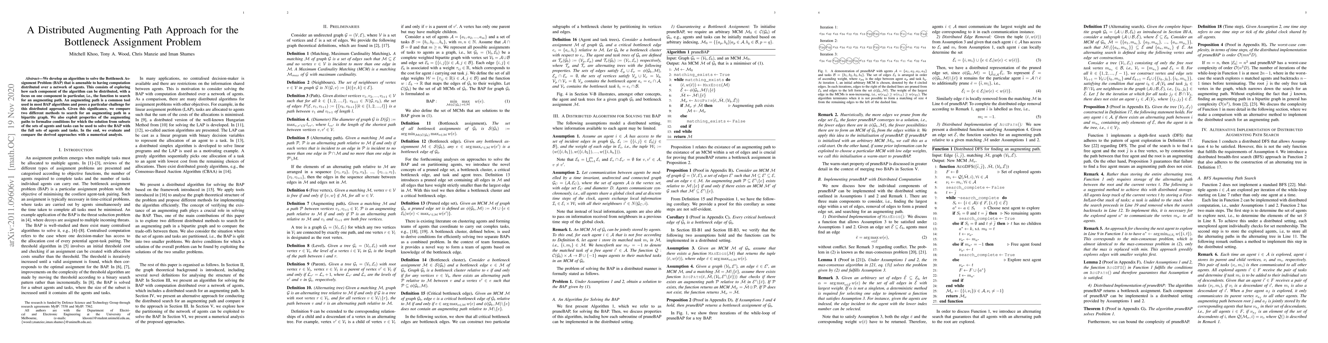We develop an algorithm to solve the Bottleneck Assignment Problem (BAP) that is amenable to having computation distributed over a network of agents. This consists of exploring how each component of the algorithm can be distributed, with a focus on one component in particular, i.e., the function to search for an augmenting path. An augmenting path is a common tool used in most BAP algorithms and poses a particular challenge for this distributed approach. Given this significance, we compare two different methods to search for an augmenting path in a bipartite graph. We also exploit properties of the augmenting paths to formalise conditions for which the solution from subsets of the sets of agents and tasks can be used to solve the BAP with the full sets of agents and tasks. In the end, we evaluate and compare the derived approaches with a numerical analysis.