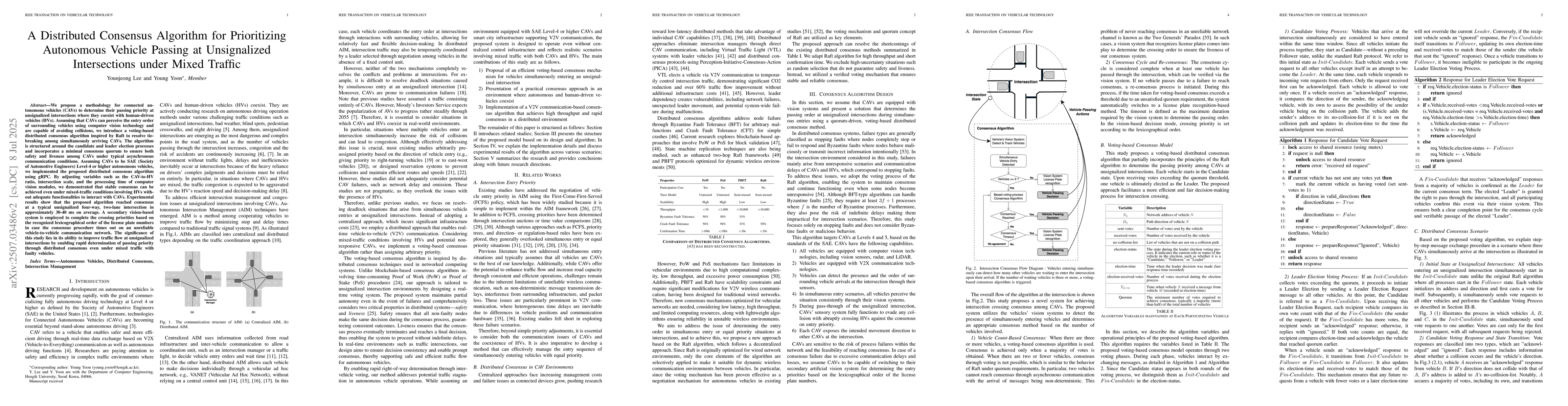 We propose a methodology for connected autonomous vehicles (CAVs) to determine their passing priority at unsignalized intersections where they coexist with human-driven vehicles (HVs). Assuming that CAVs can perceive the entry order of surrounding vehicles using computer vision technology and are capable of avoiding collisions, we introduce a voting-based distributed consensus algorithm inspired by Raft to resolve tie-breaking among simultaneously arriving CAVs. The algorithm is structured around the candidate and leader election processes and incorporates a minimal consensus quorum to ensure both safety and liveness among CAVs under typical asynchronous communication conditions. Assuming CAVs to be SAE (Society of Automotive Engineers) Level-4 or higher autonomous vehicles, we implemented the proposed distributed consensus algorithm using gRPC. By adjusting variables such as the CAV-to-HV ratio, intersection scale, and the processing time of computer vision modules, we demonstrated that stable consensus can be achieved even under mixed-traffic conditions involving HVs without adequate functionalities to interact with CAVs. Experimental results show that the proposed algorithm reached consensus at a typical unsignalized four-way, two-lane intersection in approximately 30-40 ms on average. A secondary vision-based system is employed to complete the crossing priorities based on the recognized lexicographical order of the license plate numbers in case the consensus procedure times out on an unreliable vehicle-to-vehicle communication network. The significance of this study lies in its ability to improve traffic flow at unsignalized intersections by enabling rapid determination of passing priority through distributed consensus even under mixed traffic with faulty vehicles.