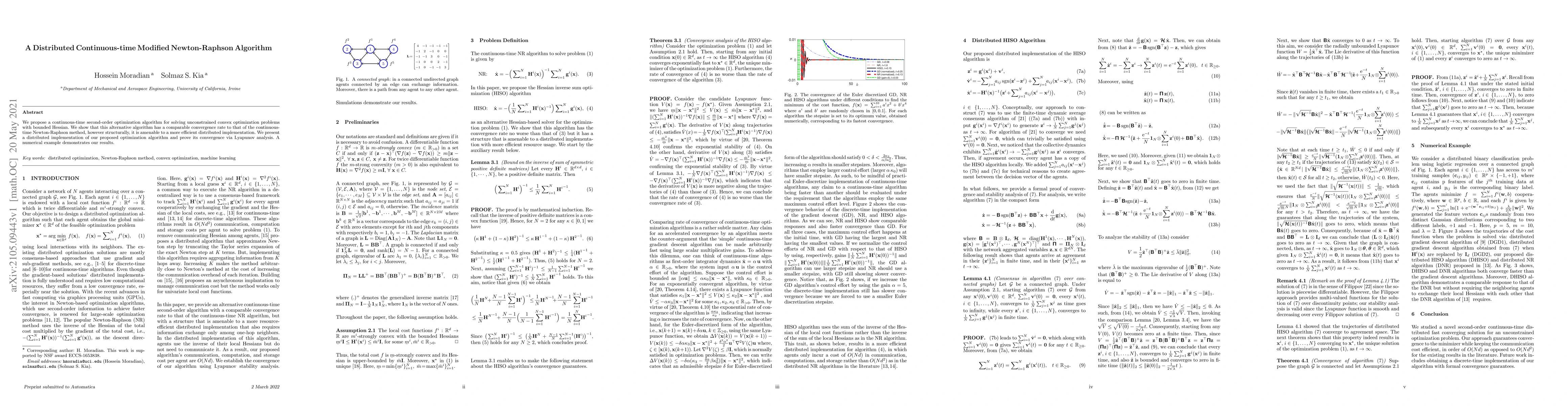 This paper introduces a continuous-time modified Newton-Raphson algorithm for solving convex optimization problems, showing comparable convergence to the traditional method but with a more efficient distributed implementation. The proposed algorithm's convergence is proven via Lyapunov analysis, and numerical results validate its effectiveness.