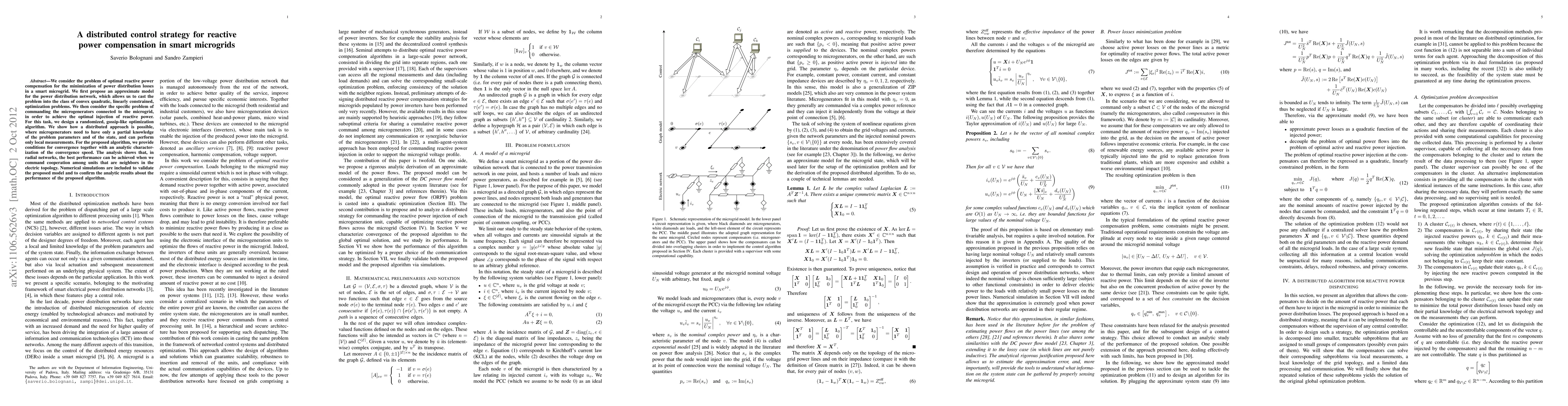 We consider the problem of optimal reactive power compensation for the minimization of power distribution losses in a smart microgrid. We first propose an approximate model for the power distribution network, which allows us to cast the problem into the class of convex quadratic, linearly constrained, optimization problems. We then consider the specific problem of commanding the microgenerators connected to the microgrid, in order to achieve the optimal injection of reactive power. For this task, we design a randomized, gossip-like optimization algorithm. We show how a distributed approach is possible, where microgenerators need to have only a partial knowledge of the problem parameters and of the state, and can perform only local measurements. For the proposed algorithm, we provide conditions for convergence together with an analytic characterization of the convergence speed. The analysis shows that, in radial networks, the best performance can be achieved when we command cooperation among units that are neighbors in the electric topology. Numerical simulations are included to validate the proposed model and to confirm the analytic results about the performance of the proposed algorithm.