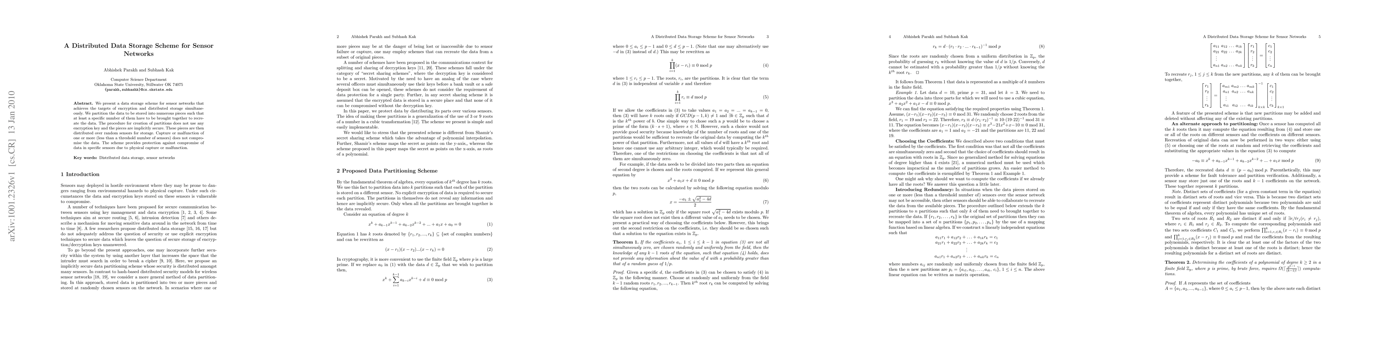 The scheme partitions data into secure pieces that can be stored on multiple random sensors, making it resilient to sensor capture or malfunction without compromising overall data integrity.
