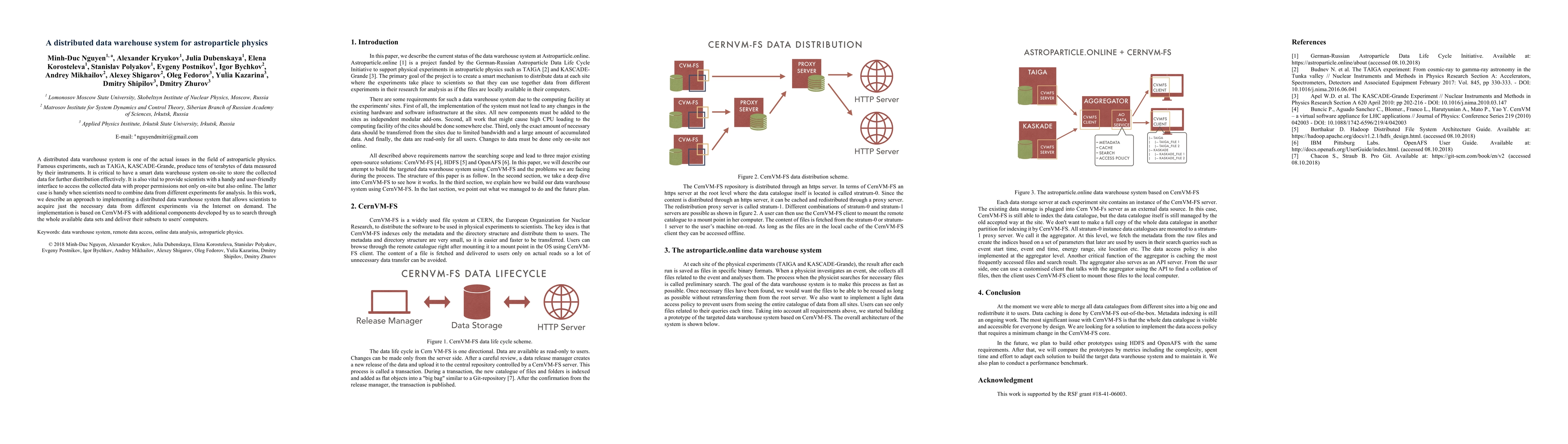 A distributed data warehouse system is one of the actual issues in the field of astroparticle physics. Famous experiments, such as TAIGA, KASCADE-Grande, produce tens of terabytes of data measured by their instruments. It is critical to have a smart data warehouse system on-site to store the collected data for further distribution effectively. It is also vital to provide scientists with a handy and user-friendly interface to access the collected data with proper permissions not only on-site but also online. The latter case is handy when scientists need to combine data from different experiments for analysis. In this work, we describe an approach to implementing a distributed data warehouse system that allows scientists to acquire just the necessary data from different experiments via the Internet on demand. The implementation is based on CernVM-FS with additional components developed by us to search through the whole available data sets and deliver their subsets to users' computers.