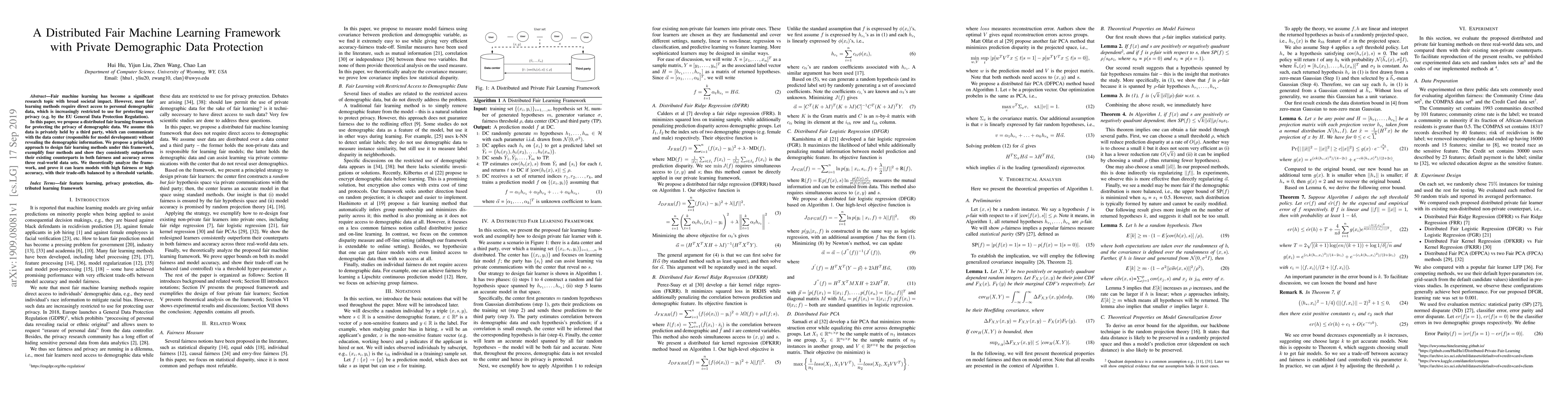 This paper proposes a distributed fair machine learning framework that protects the privacy of demographic data held by a third party. It introduces four fair learning methods that outperform existing approaches in both fairness and accuracy, while theoretically analyzing the balance between fairness and accuracy through a threshold variable.