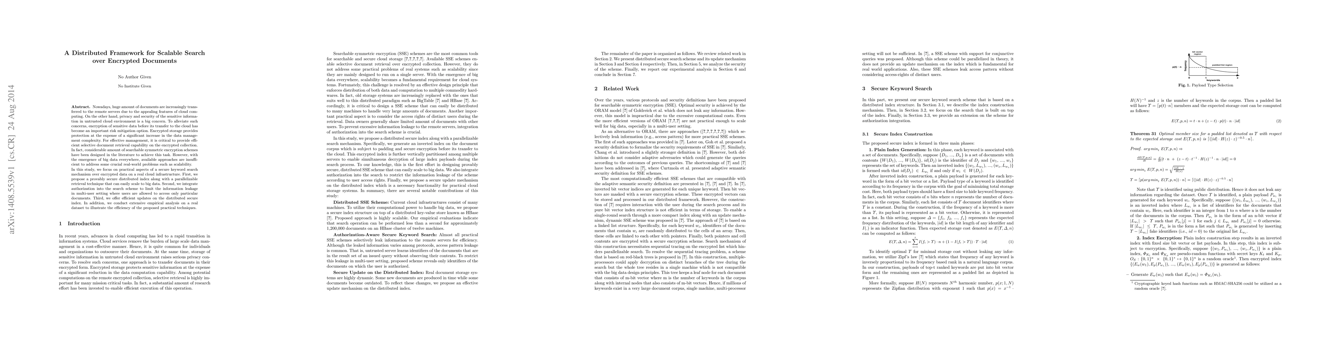 This paper proposes a scalable distributed framework for secure keyword search over encrypted documents in cloud environments, addressing the challenges of big data. It introduces a secure distributed index and parallelizable retrieval technique, integrates authorization to limit information leakage, and provides efficient updates, validated through empirical analysis on a real dataset.