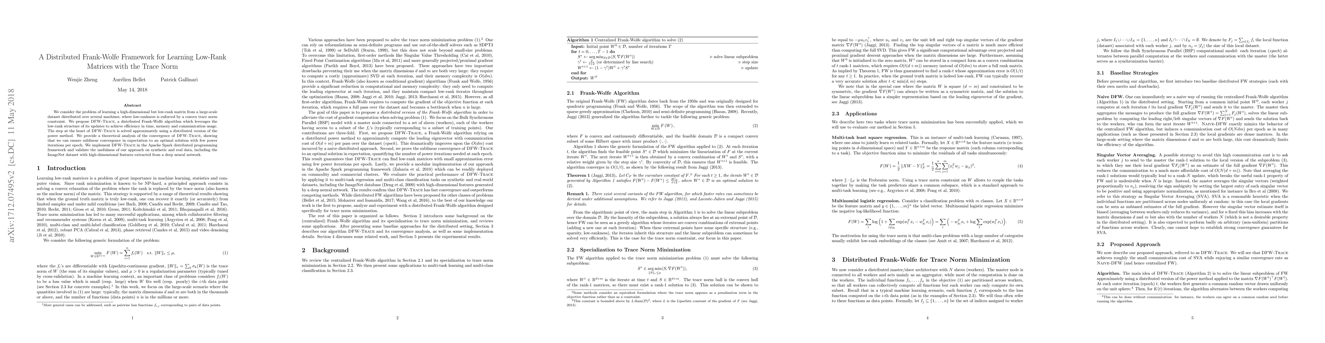This paper proposes DFW-Trace, a distributed Frank-Wolfe algorithm for learning low-rank matrices under a trace norm constraint, leveraging the low-rank structure to enhance efficiency. The algorithm uses a distributed power method to approximate key steps, and theoretical analysis shows sublinear convergence with minimal computational overhead.