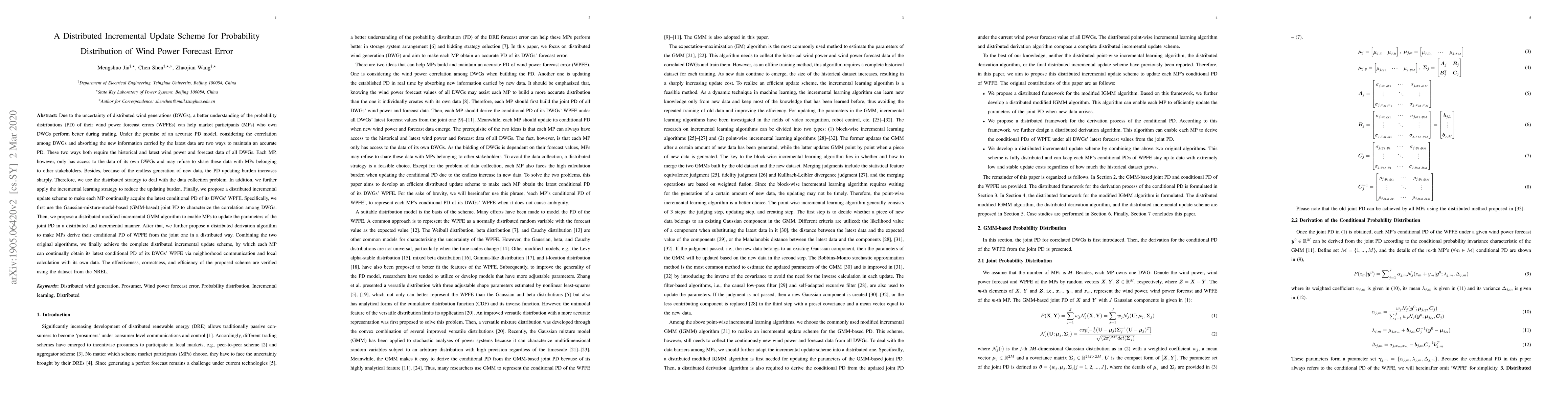 This paper proposes a distributed incremental update scheme to continually refine the probability distribution of wind power forecast errors for distributed wind generations. It utilizes a Gaussian-mixture-model-based joint PD and a distributed modified incremental GMM algorithm to update the parameters in a distributed manner, allowing market participants to derive their own conditional PDs locally.