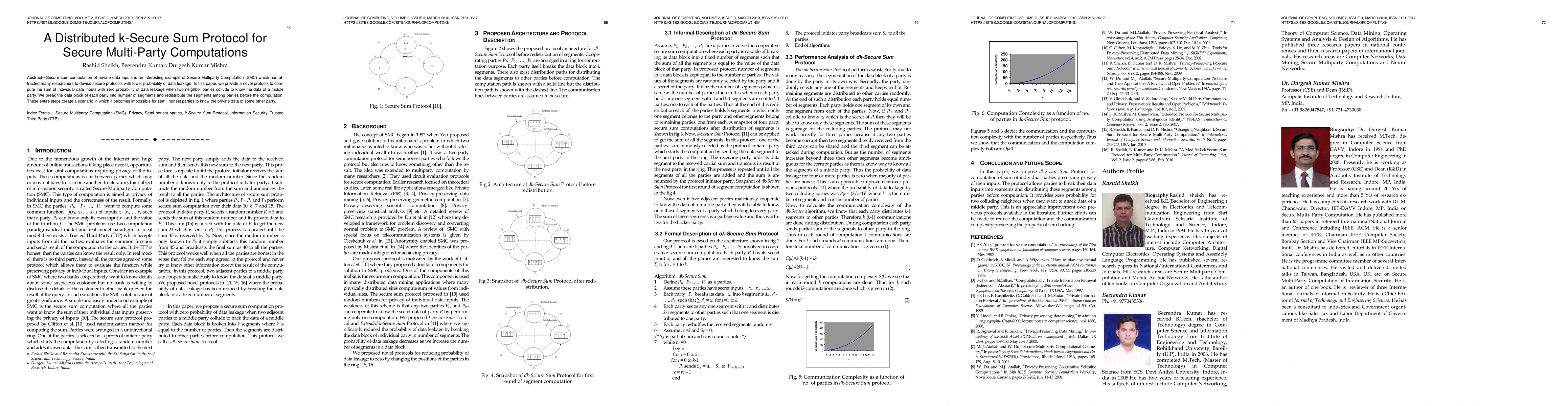 This paper presents a novel distributed k-secure sum protocol for Secure Multiparty Computation (SMC) that ensures zero data leakage even when two neighboring parties collude. The protocol segments and redistributes data blocks among parties, making it impossible for semi-honest parties to access private data.