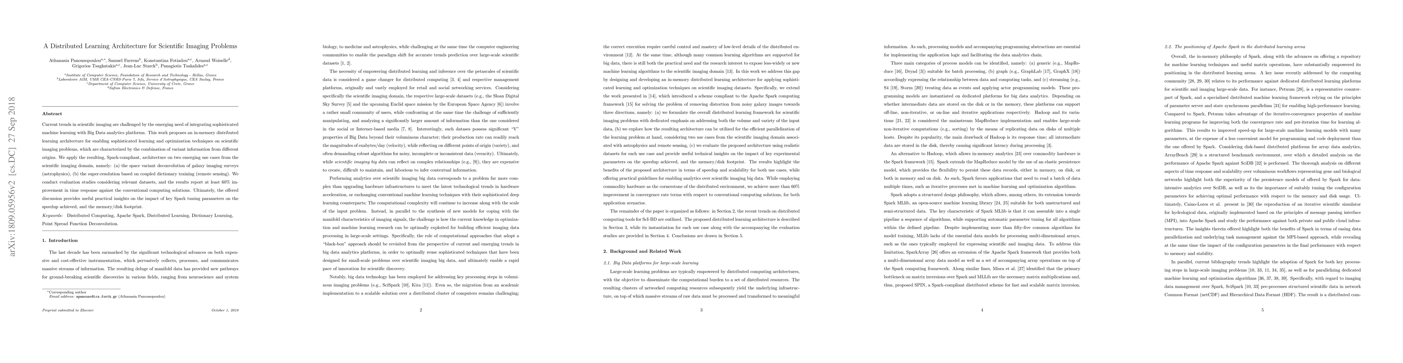 A distributed learning architecture is proposed for scientific imaging problems, achieving at least 60% time response improvement over conventional solutions through Spark-compliant optimization.