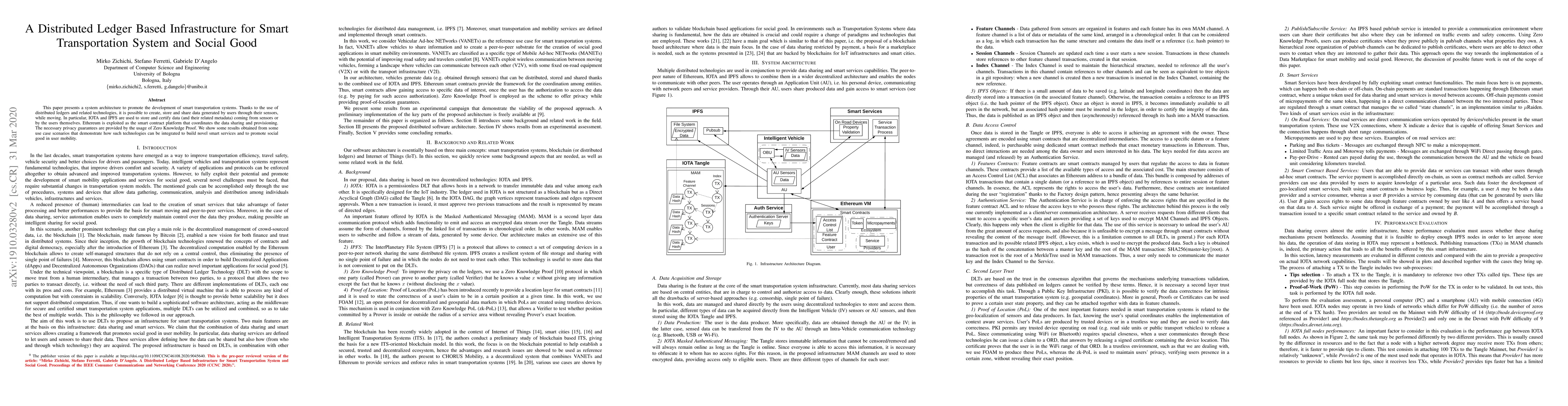 This paper proposes a distributed ledger-based infrastructure for smart transportation, utilizing IOTA, IPFS, and Ethereum to store and manage user-generated mobility data, while ensuring privacy through Zero Knowledge Proofs. The system aims to enhance smart services and promote social good in user mobility.