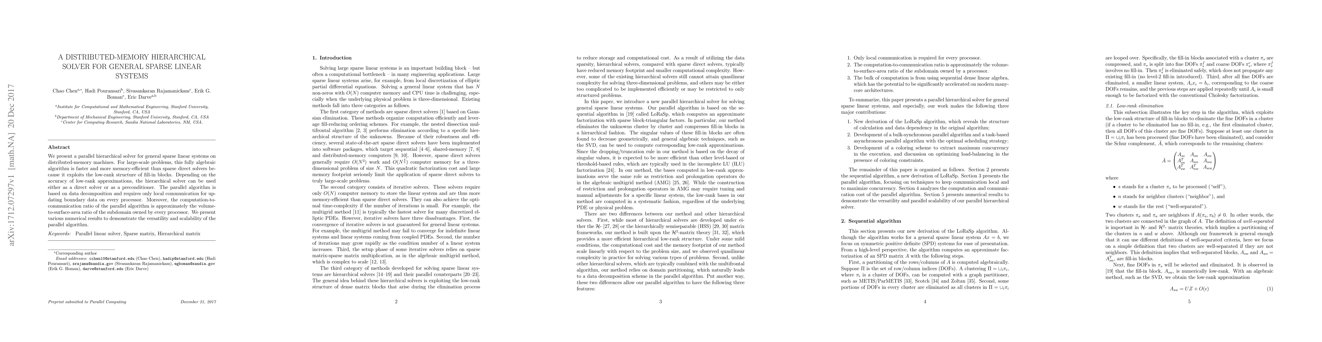 This paper introduces a parallel hierarchical solver for distributed-memory systems that efficiently solves large sparse linear systems, leveraging low-rank approximations for speed and memory efficiency. The algorithm scales well and can function as either a direct solver or preconditioner.