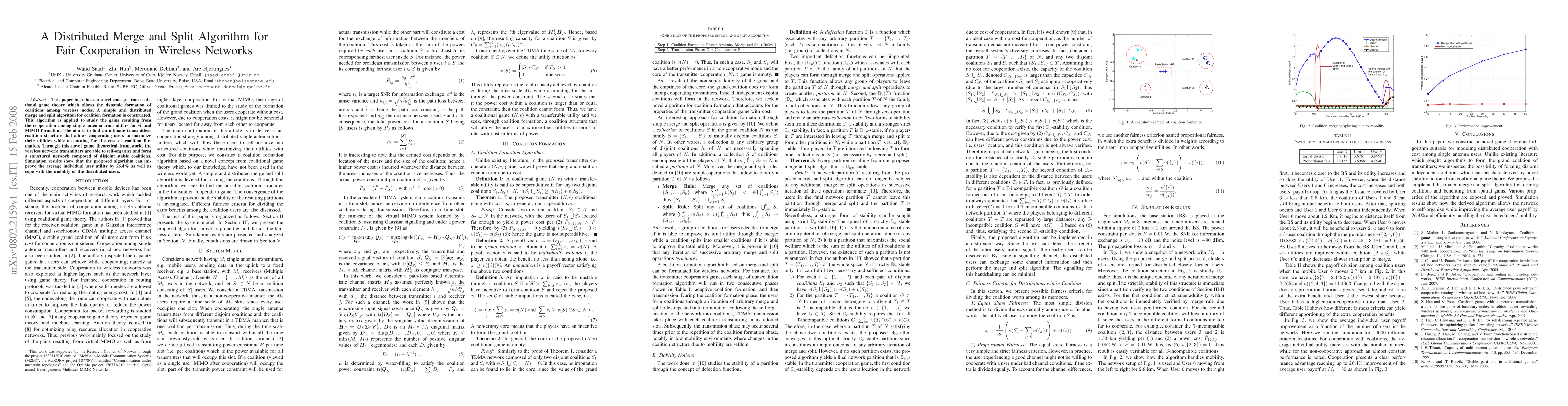 This paper introduces a novel concept from coalitional game theory which allows the dynamic formation of coalitions among wireless nodes. A simple and distributed merge and split algorithm for coalition formation is constructed. This algorithm is applied to study the gains resulting from the cooperation among single antenna transmitters for virtual MIMO formation. The aim is to find an ultimate transmitters coalition structure that allows cooperating users to maximize their utilities while accounting for the cost of coalition formation. Through this novel game theoretical framework, the wireless network transmitters are able to self-organize and form a structured network composed of disjoint stable coalitions. Simulation results show that the proposed algorithm can improve the average individual user utility by 26.4% as well as cope with the mobility of the distributed users.