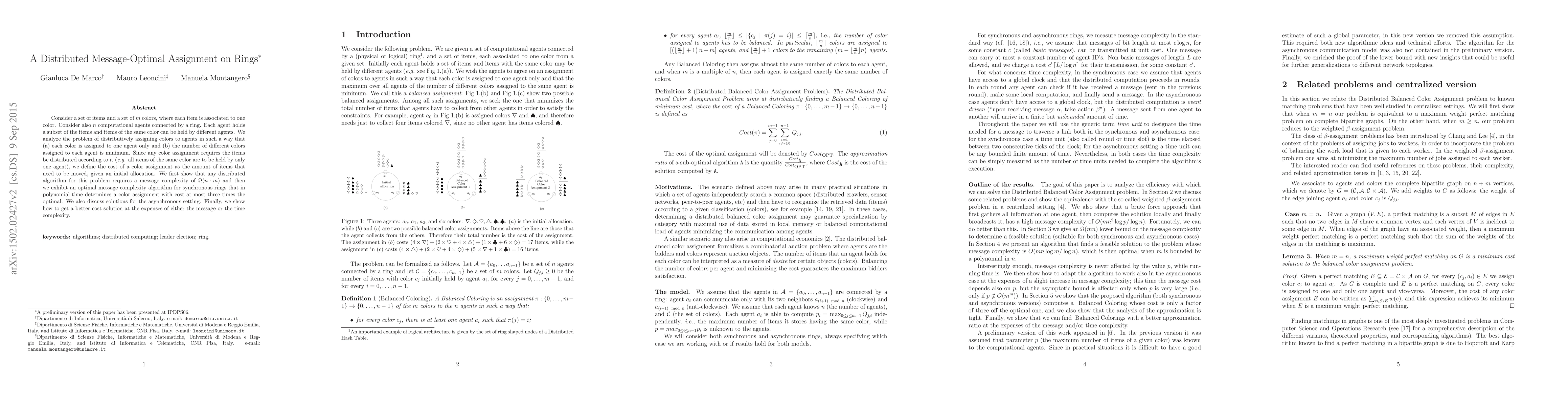 Consider a set of items and a set of $m$ colors, where each item is associated to one color. Consider also $n$ computational agents connected by a ring. Each agent holds a subset of the items and items of the same color can be held by different agents. We analyze the problem of distributively assigning colors to agents in such a way that (a) each color is assigned to one agent only and (b) the number of different colors assigned to each agent is minimum. Since any color assignment requires the items be distributed according to it (e.g. all items of the same color are to be held by only one agent), we define the cost of a color assignment as the amount of items that need to be moved, given an initial allocation. We first show that any distributed algorithm for this problem requires a message complexity of $\Omega(n\cdot m)$ and then we exhibit an optimal message complexity algorithm for synchronous rings that in polynomial time determines a color assignment with cost at most three times the optimal. We also discuss solutions for the asynchronous setting. Finally, we show how to get a better cost solution at the expenses of either the message or the time complexity.