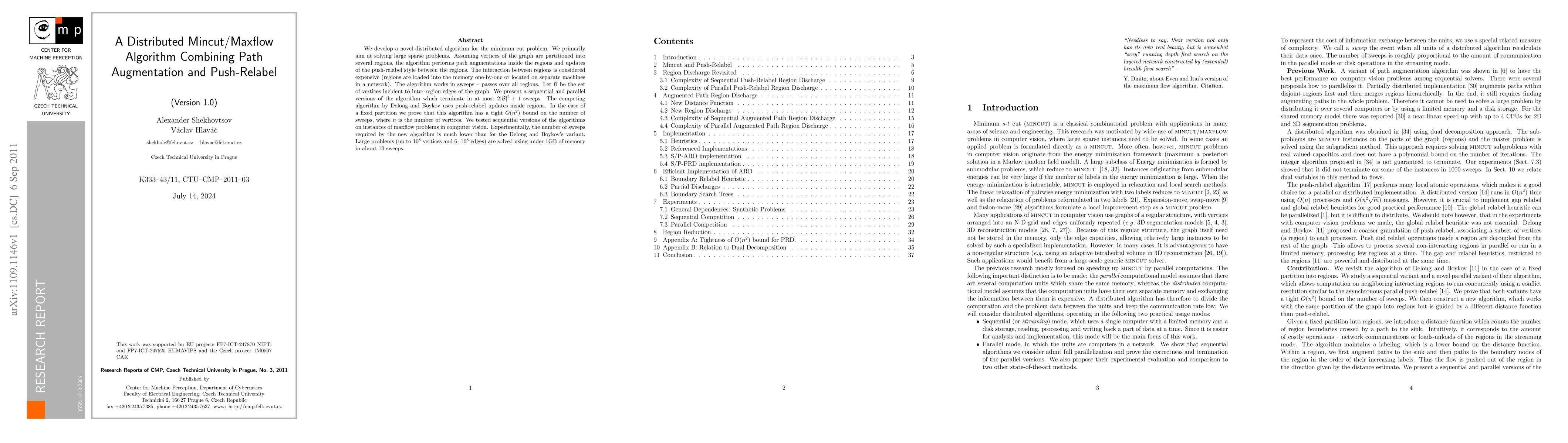 This paper presents a novel distributed algorithm for solving large sparse minimum cut problems by combining path augmentation and push-relabel methods. The algorithm performs intra-region augmentations and inter-region updates in sweeps, showing significantly fewer sweeps compared to a competing method, even for very large problems with minimal memory usage.