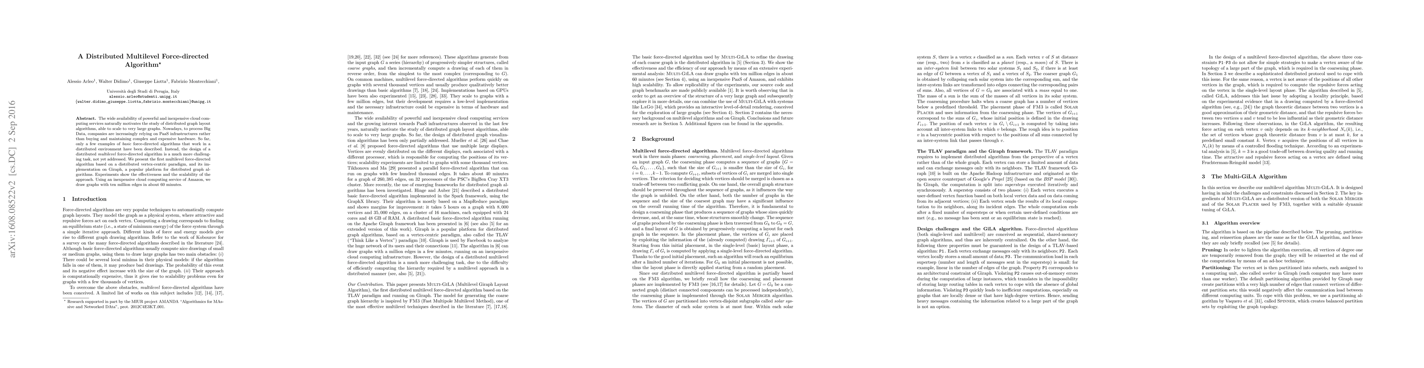 This paper introduces a novel distributed multilevel force-directed algorithm implemented on Giraph for scalable graph layout in large datasets. Experiments demonstrate its effectiveness and scalability, enabling the drawing of graphs with ten million edges in approximately 60 minutes using cloud computing resources.