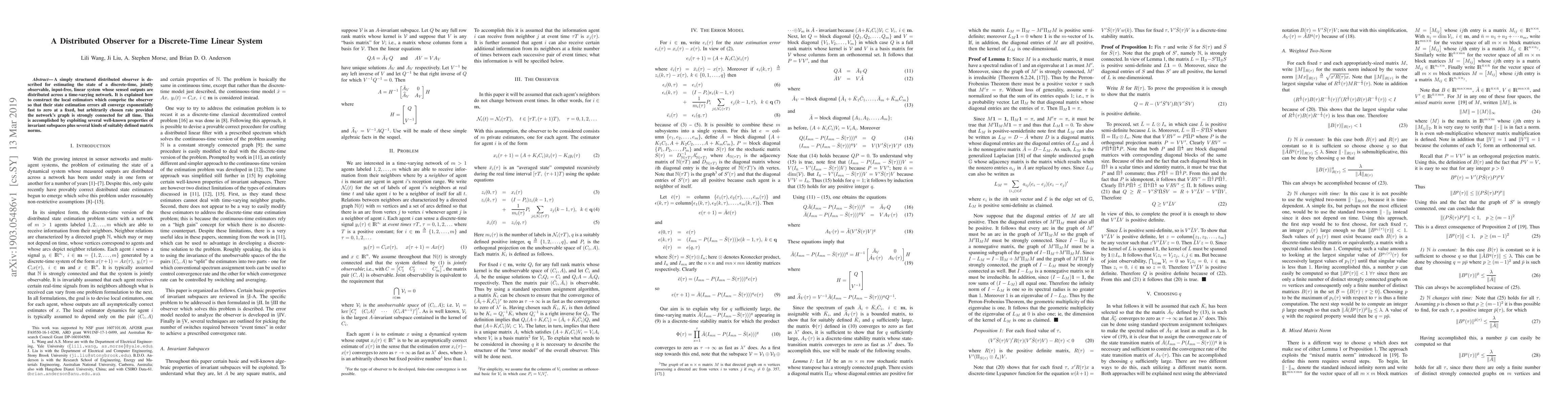 A simply structured distributed observer is described for estimating the state of a discrete-time, jointly observable, input-free, linear system whose sensed outputs are distributed across a time-varying network. It is explained how to construct the local estimators which comprise the observer so that their state estimation errors all converge exponentially fast to zero at a fixed, but arbitrarily chosen rate provided the network's graph is strongly connected for all time. This is accomplished by exploiting several well-known properties of invariant subspaces plus several kinds of suitably defined matrix norms.