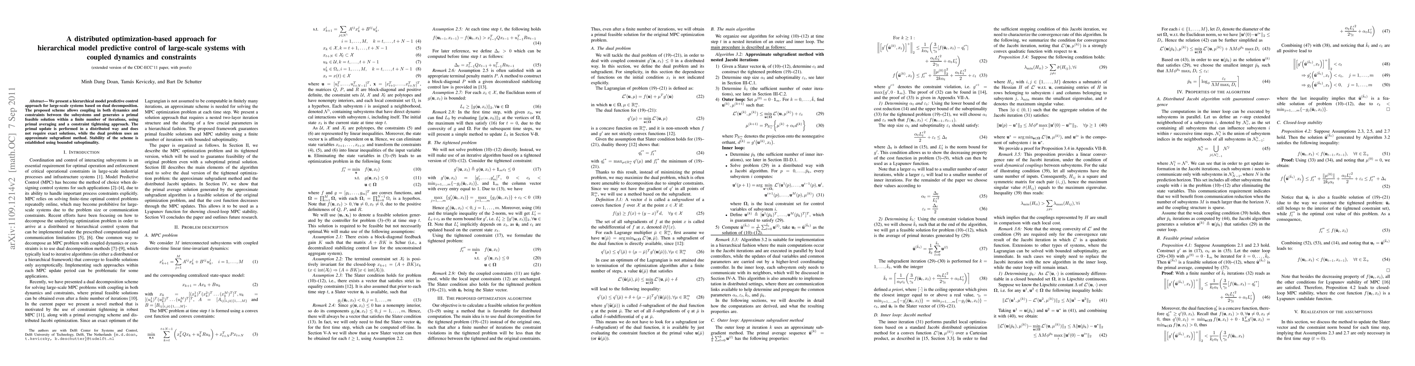 We present a hierarchical model predictive control approach for large-scale systems based on dual decomposition. The proposed scheme allows coupling in both dynamics and constraints between the subsystems and generates a primal feasible solution within a finite number of iterations, using primal averaging and a constraint tightening approach. The primal update is performed in a distributed way and does not require exact solutions, while the dual problem uses an approximate subgradient method. Stability of the scheme is established using bounded suboptimality.