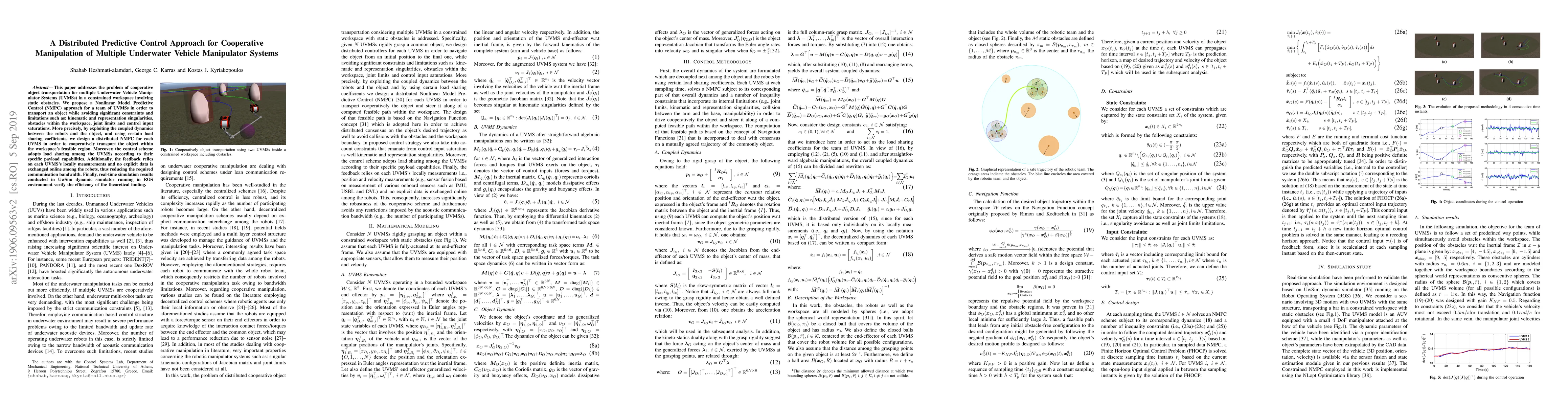 This paper proposes a distributed Nonlinear Model Predictive Control (NMPC) approach for cooperative manipulation of multiple Underwater Vehicle Manipulator Systems (UVMSs) to transport objects while avoiding obstacles and constraints. The control scheme uses load sharing and local measurements, minimizing communication bandwidth and demonstrating efficiency through real-time simulations.