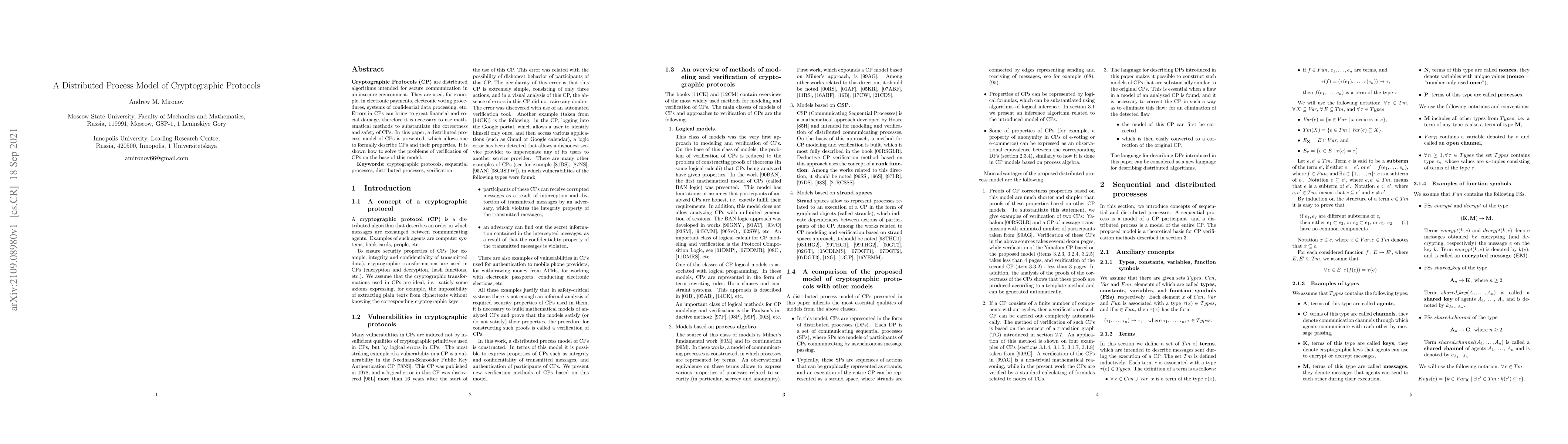 This paper presents a distributed process model for verifying the correctness and safety of Cryptographic Protocols, which can help prevent financial and social damage in insecure environments.