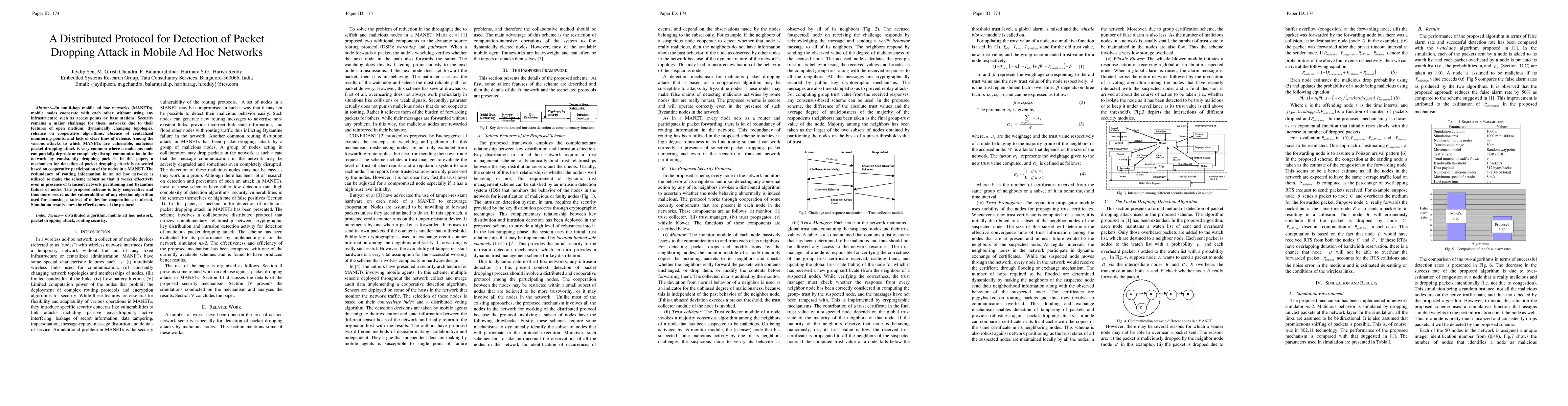 This paper proposes a distributed protocol for detecting packet dropping attacks in mobile ad hoc networks (MANETs) by leveraging cooperative participation among nodes. The scheme utilizes routing information redundancy to remain effective even during network partitioning and Byzantine failures, ensuring enhanced security without relying on election algorithms.
