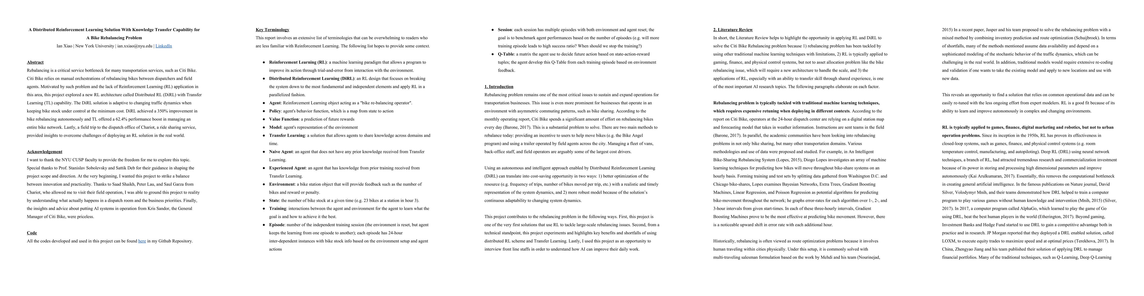 This research proposes a Distributed Reinforcement Learning (DiRL) solution with Transfer Learning (TL) for optimizing bike rebalancing in transportation services, achieving a 350% improvement in autonomous rebalancing and a 62.4% performance boost. Field insights from Chariot's dispatch office highlight real-world deployment challenges.