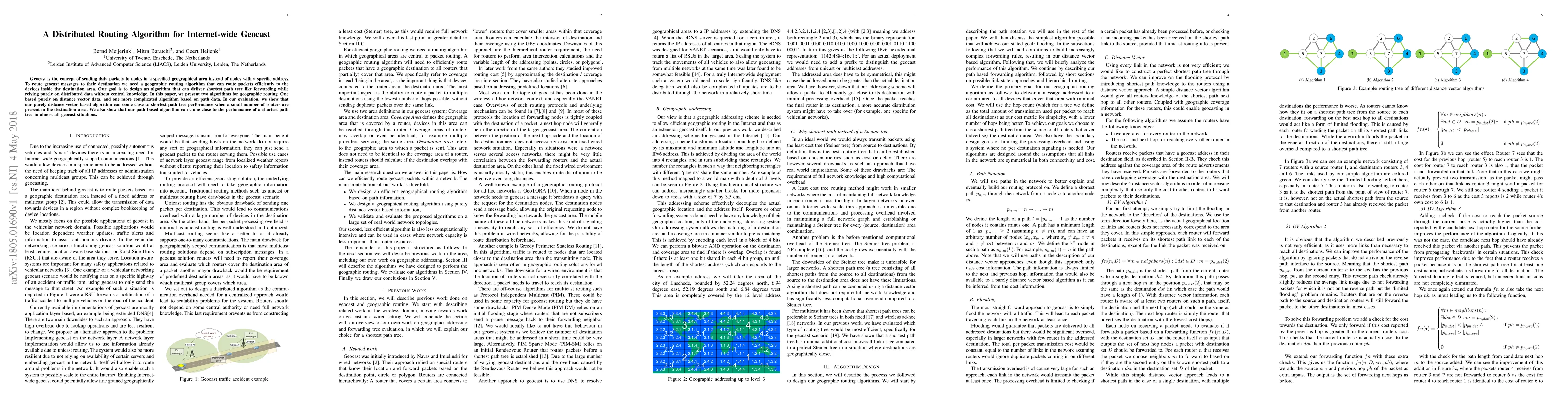 Geocast is the concept of sending data packets to nodes in a specified geographical area instead of nodes with a specific address. To route geocast messages to their destination we need a geographic routing algorithm that can route packets efficiently to the devices inside the destination area. Our goal is to design an algorithm that can deliver shortest path tree like forwarding while relying purely on distributed data without central knowledge. In this paper, we present two algorithms for geographic routing. One based purely on distance vector data, and one more complicated algorithm based on path data. In our evaluation, we show that our purely distance vector based algorithm can come close to shortest path tree performance when a small number of routers are present in the destination area. We also show that our path based algorithm can come close to the performance of a shortest path tree in almost all geocast situations.