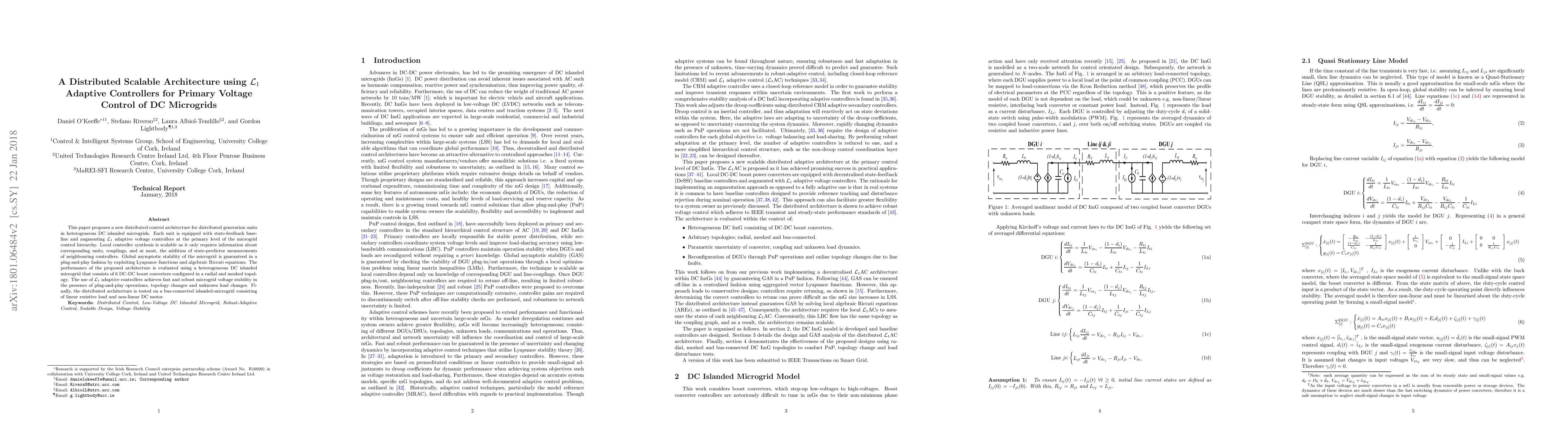 This paper proposes a new distributed control architecture for distributed generation units in heterogeneous DC islanded microgrids. Each unit is equipped with state-feedback baseline and augmenting $\mathcal{L}_1$ adaptive voltage controllers at the primary level of the microgrid control hierarchy. Local controller synthesis is scalable as it only requires information about corresponding units, couplings, and at most, the addition of state-predictor measurements of neighbouring controllers. Global asymptotic stability of the microgrid is guaranteed in a plug-and-play fashion by exploiting Lyapunov functions and algebraic Riccati equations. The performance of the proposed architecture is evaluated using a heterogeneous DC islanded microgrid that consists of 6 DC-DC boost converters configured in a radial and meshed topology. The use of $\mathcal{L}_1$ adaptive controllers achieves fast and robust microgrid voltage stability in the presence of plug-and-play operations, topology changes and unknown load changes. Finally, the distributed architecture is tested on a bus-connected islanded-microgrid consisting of linear resistive load and non-linear DC motor.
