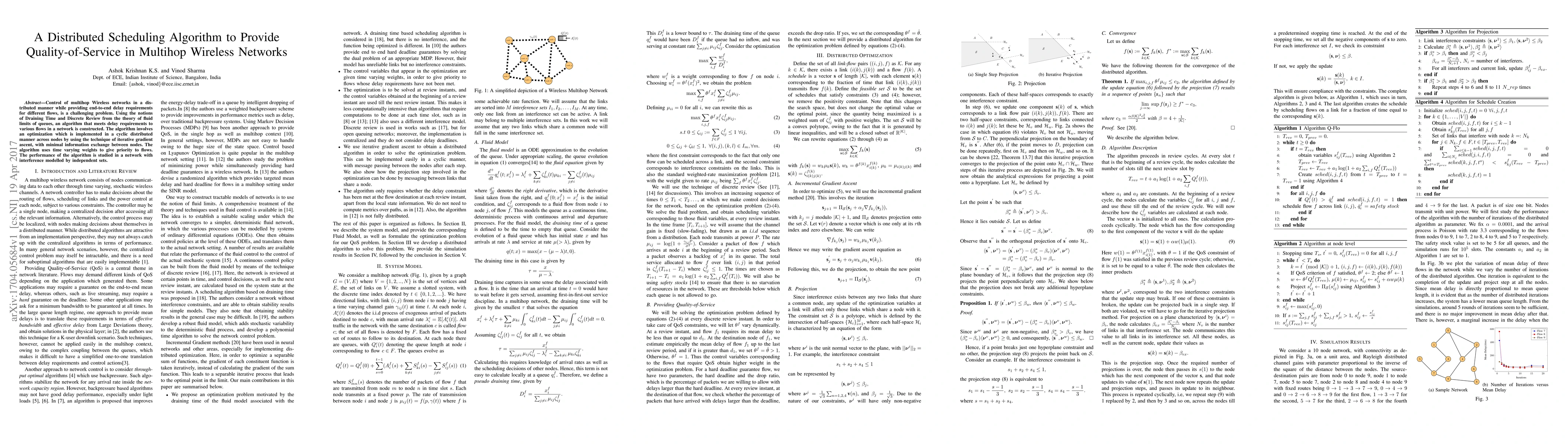Control of multihop Wireless networks in a distributed manner while providing end-to-end delay requirements for different flows, is a challenging problem. Using the notions of Draining Time and Discrete Review from the theory of fluid limits of queues, an algorithm that meets delay requirements to various flows in a network is constructed. The algorithm involves an optimization which is implemented in a cyclic distributed manner across nodes by using the technique of iterative gradient ascent, with minimal information exchange between nodes. The algorithm uses time varying weights to give priority to flows. The performance of the algorithm is studied in a network with interference modelled by independent sets.