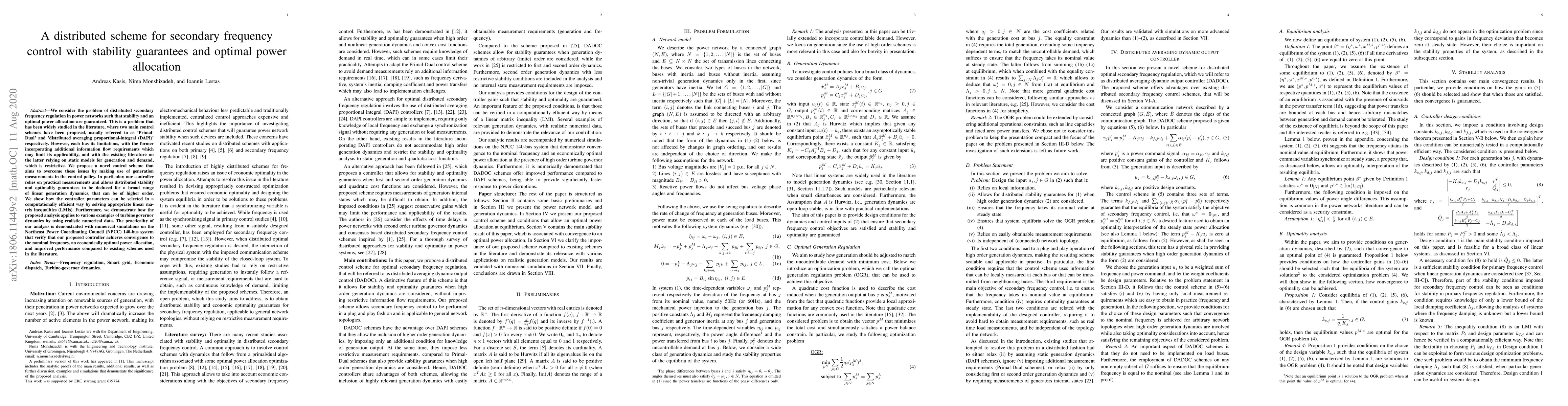 This paper proposes a novel distributed control scheme for secondary frequency regulation in power networks, ensuring stability and optimal power allocation. The scheme overcomes limitations of existing methods by utilizing generation measurements, providing distributed stability and optimality guarantees, and demonstrating practical applicability through simulations on a 140-bus system.