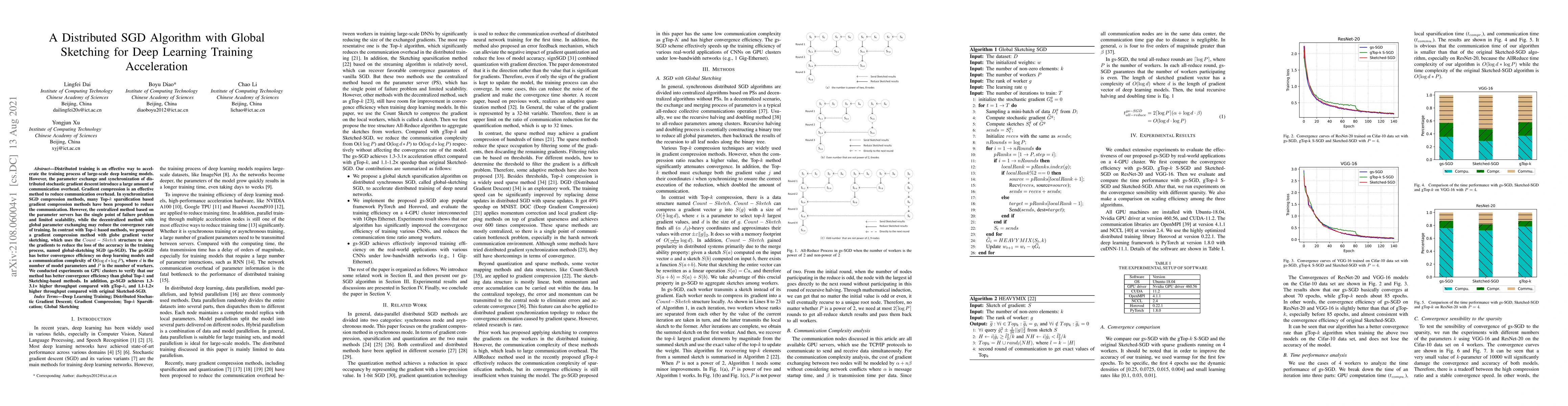 This paper proposes a global-sketching SGD (gs-SGD) algorithm to accelerate distributed training of deep learning models by using gradient compression to reduce communication overhead. The method employs Count-Sketch to maintain gradient accuracy, achieving better convergence efficiency and lower communication complexity compared to Top-k based methods.