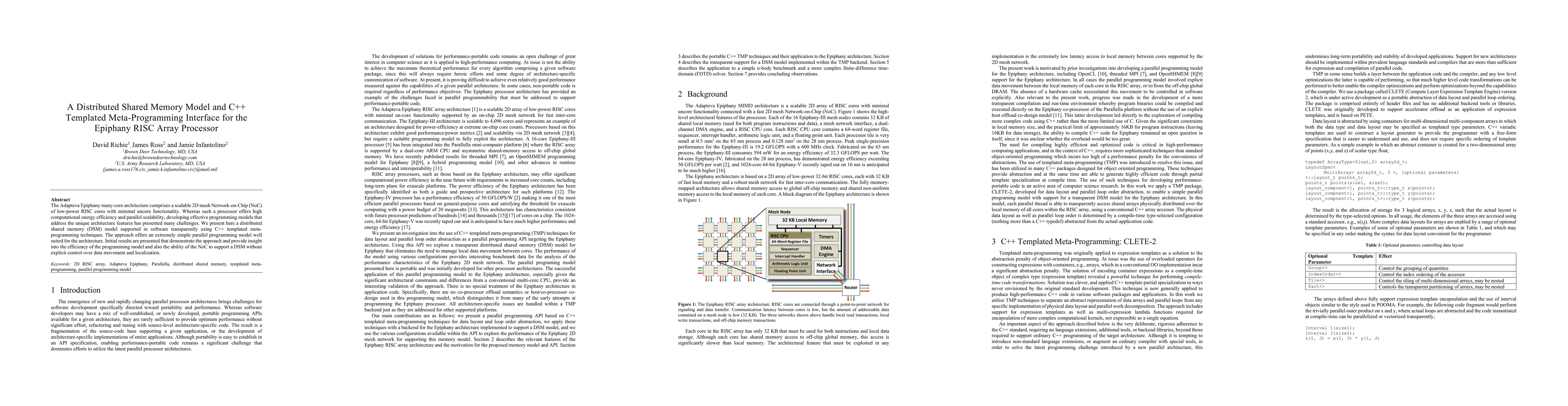This paper introduces a distributed shared memory (DSM) model for the Adapteva Epiphany many-core processor, utilizing C++ templated metaprogramming to simplify parallel programming. The proposed model demonstrates high computational efficiency and scalability without requiring explicit data management.