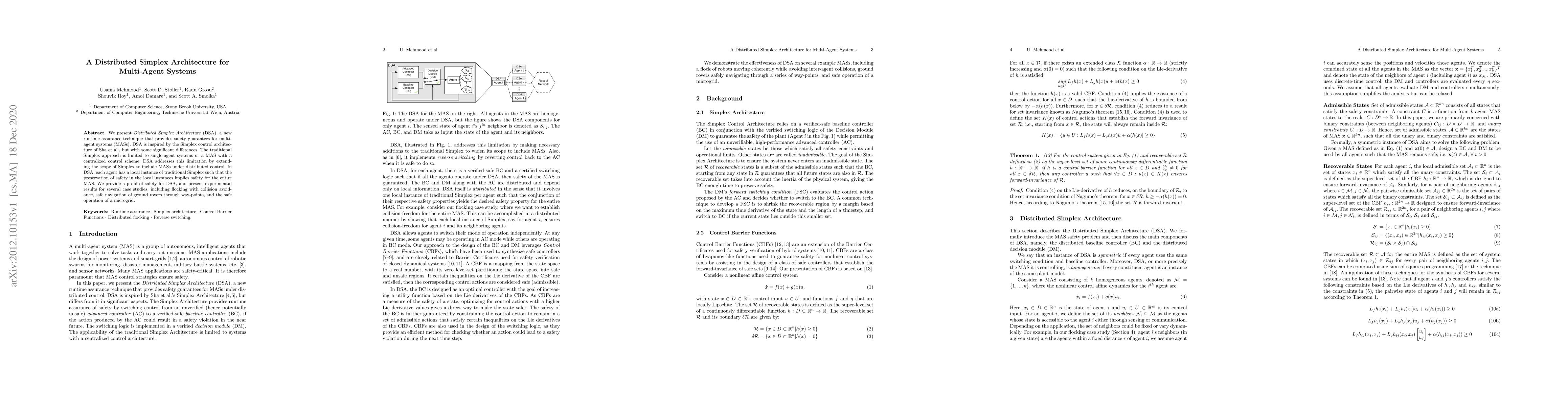 The Distributed Simplex Architecture (DSA) extends the Simplex control architecture to multi-agent systems under distributed control, ensuring safety through local instances of Simplex. Experimental results demonstrate its effectiveness in applications like flocking, rover navigation, and microgrid operation.