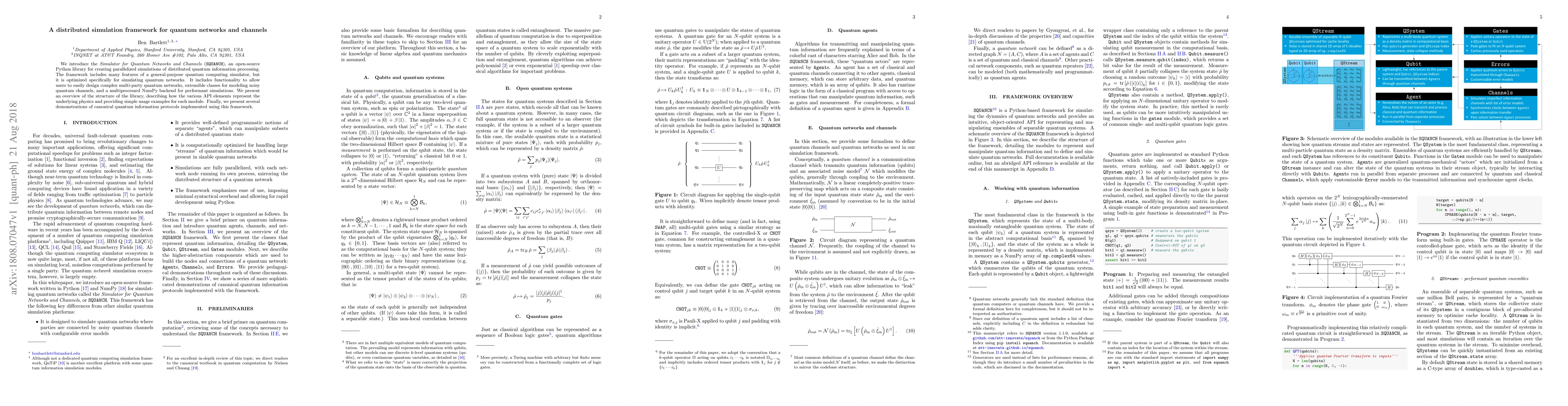 The paper introduces $\texttt{SQUANCH}$, an open-source Python library for parallelized simulations of distributed quantum networks, featuring extensible classes for noisy quantum channels and a multiprocessed backend. The framework supports complex multi-party quantum network designs and demonstrates canonical quantum information protocols.
