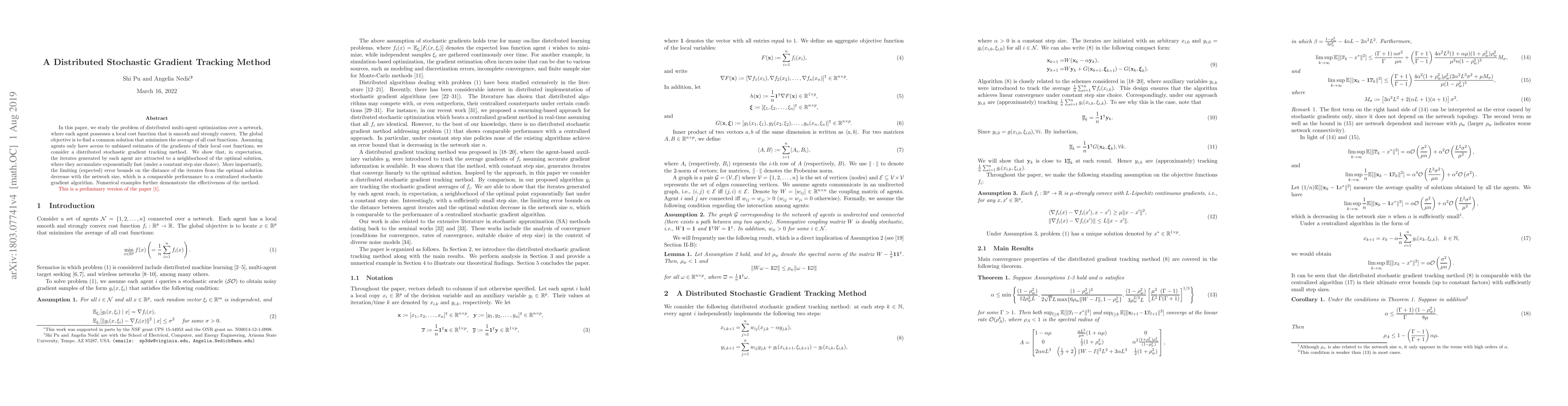This paper proposes a distributed stochastic gradient tracking method for multi-agent optimization over a network, showing that agents converge to a neighborhood of the optimal solution and that error bounds improve with network size, comparable to centralized methods. Numerical examples validate the method's effectiveness.