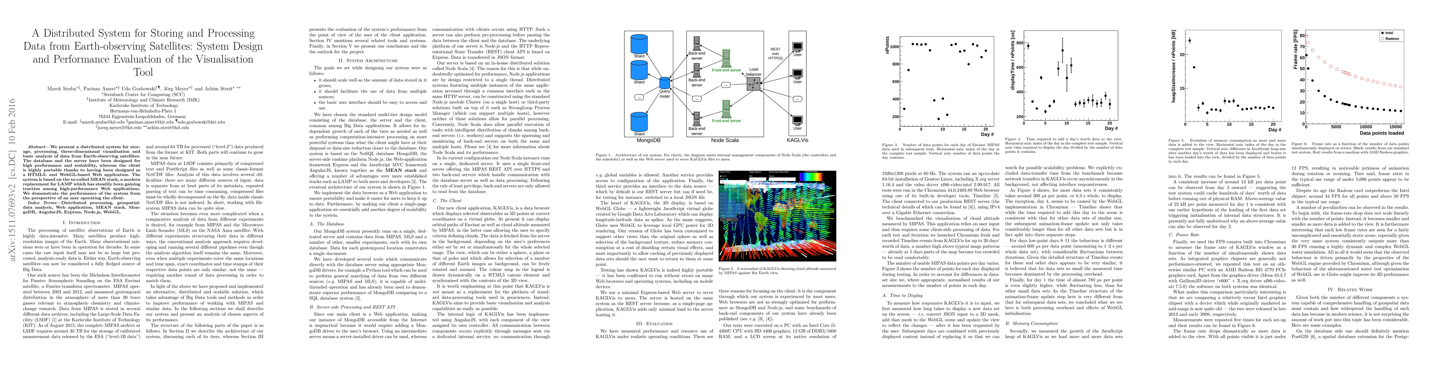 We present a distributed system for storage, processing, three-dimensional visualisation and basic analysis of data from Earth-observing satellites. The database and the server have been designed for high performance and scalability, whereas the client is highly portable thanks to having been designed as a HTML5- and WebGL-based Web application. The system is based on the so-called MEAN stack, a modern replacement for LAMP which has steadily been gaining traction among high-performance Web applications. We demonstrate the performance of the system from the perspective of an user operating the client.