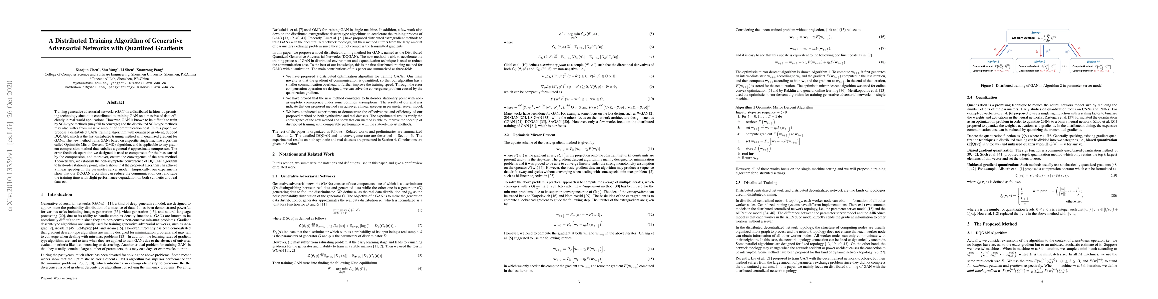 This paper proposes DQGAN, a distributed training algorithm for GANs that employs quantized gradients to reduce communication costs. It leverages the Optimistic Mirror Descent algorithm and ensures convergence through error-feedback, achieving linear speedup in training time with minimal performance loss.