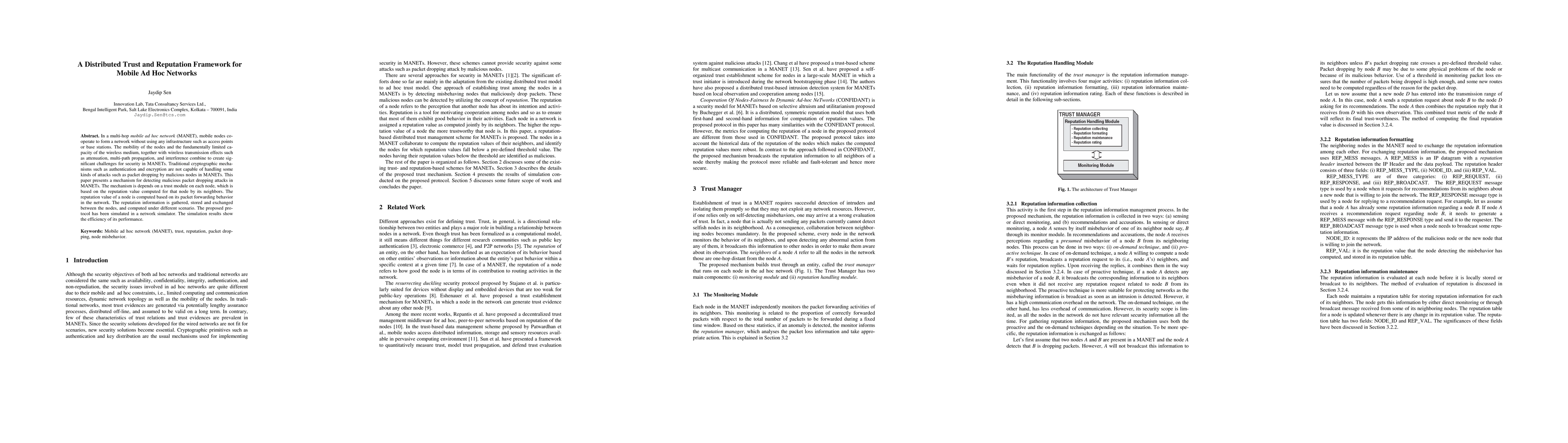 This paper proposes a distributed trust and reputation framework to detect malicious packet dropping attacks in mobile ad hoc networks (MANETs). Each node uses a trust module based on reputation values computed from packet forwarding behavior, which are exchanged among nodes to identify and mitigate attacks. Simulation results demonstrate the protocol's effectiveness.