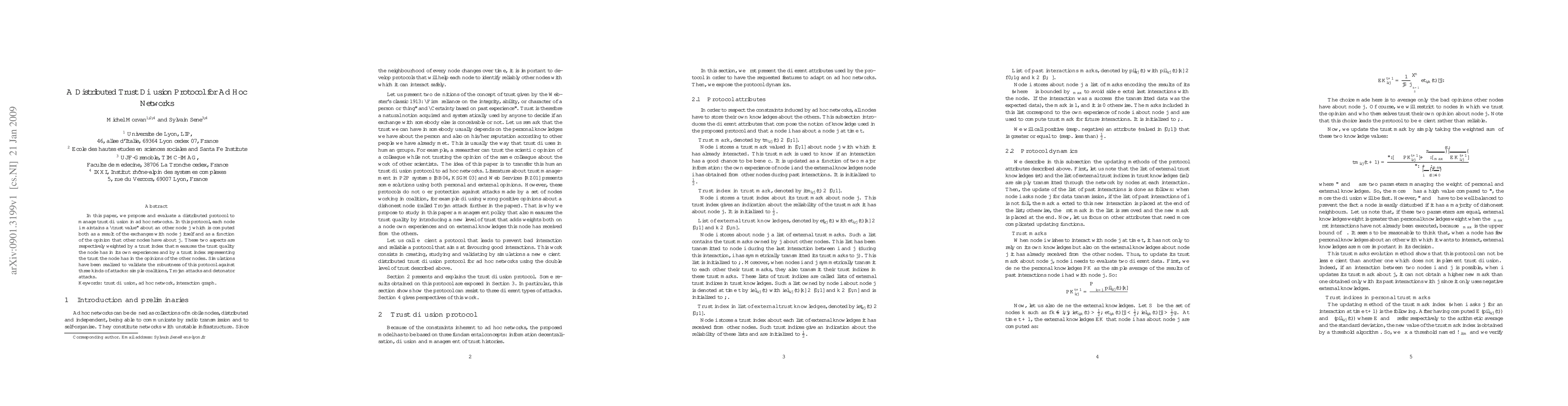 This paper proposes a distributed trust diffusion protocol for ad hoc networks, where each node's trust value of another is computed based on direct interactions and opinions from other nodes. Simulations demonstrate the protocol's robustness against coalition, Trojan, and detonator attacks.