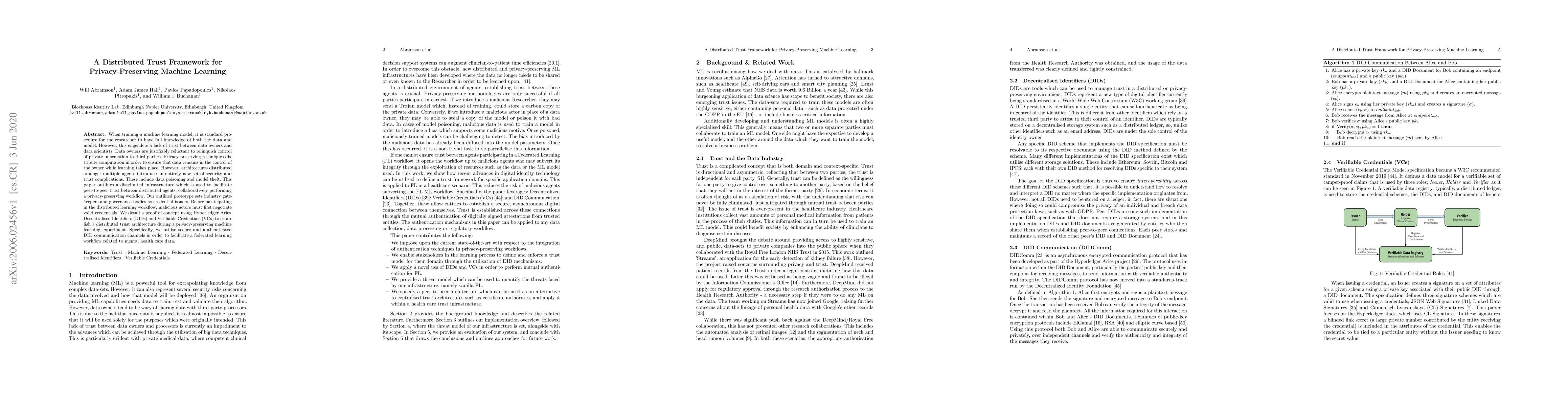 When training a machine learning model, it is standard procedure for the researcher to have full knowledge of both the data and model. However, this engenders a lack of trust between data owners and data scientists. Data owners are justifiably reluctant to relinquish control of private information to third parties. Privacy-preserving techniques distribute computation in order to ensure that data remains in the control of the owner while learning takes place. However, architectures distributed amongst multiple agents introduce an entirely new set of security and trust complications. These include data poisoning and model theft. This paper outlines a distributed infrastructure which is used to facilitate peer-to-peer trust between distributed agents; collaboratively performing a privacy-preserving workflow. Our outlined prototype sets industry gatekeepers and governance bodies as credential issuers. Before participating in the distributed learning workflow, malicious actors must first negotiate valid credentials. We detail a proof of concept using Hyperledger Aries, Decentralised Identifiers (DIDs) and Verifiable Credentials (VCs) to establish a distributed trust architecture during a privacy-preserving machine learning experiment. Specifically, we utilise secure and authenticated DID communication channels in order to facilitate a federated learning workflow related to mental health care data.