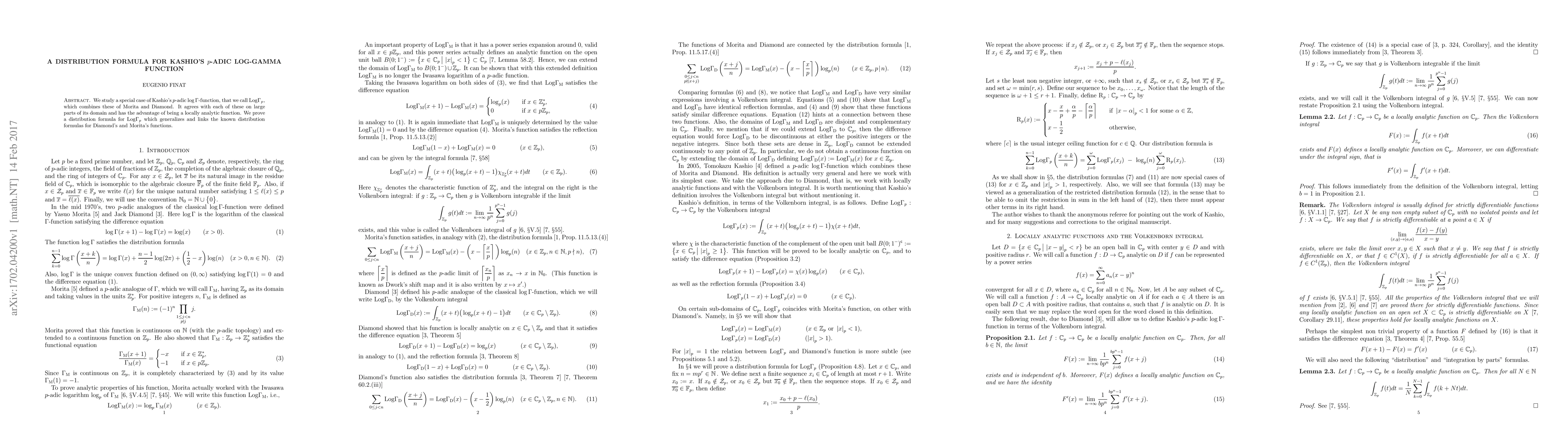 We study a special case of Kashio's $p$-adic $\log\Gamma$-function, that we call ${\mathrm{Log}}\Gamma_{\mathit{p}}$, which combines these of Morita and Diamond. It agrees with each of these on large parts of its domain and has the advantage of being a locally analytic function. We prove a distribution formula for ${\mathrm{Log}}\Gamma_{\mathit{p}}$ which generalizes and links the known distribution formulas for Diamond's and Morita's functions.