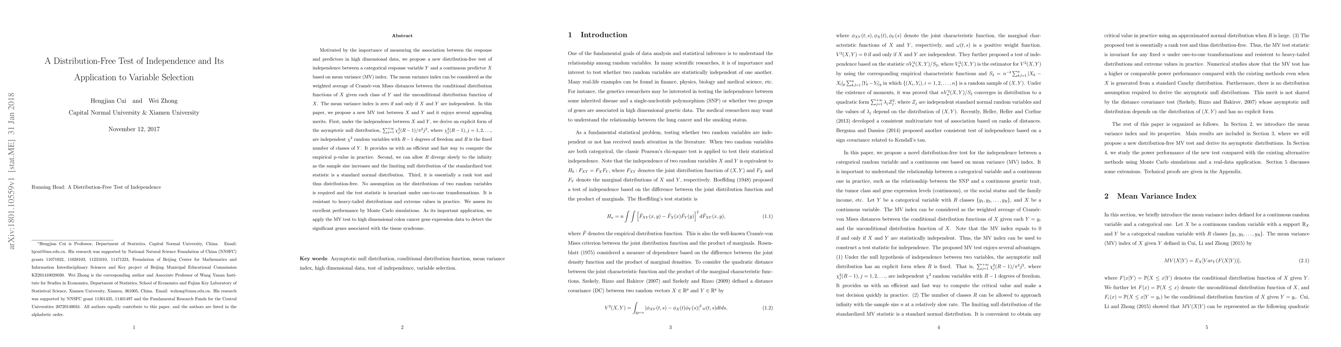 This paper proposes a new distribution-free mean variance test for assessing independence between a categorical and a continuous variable, demonstrating higher power than existing tests and applying it to high-dimensional gene expression data to identify significant cancer-related genes.