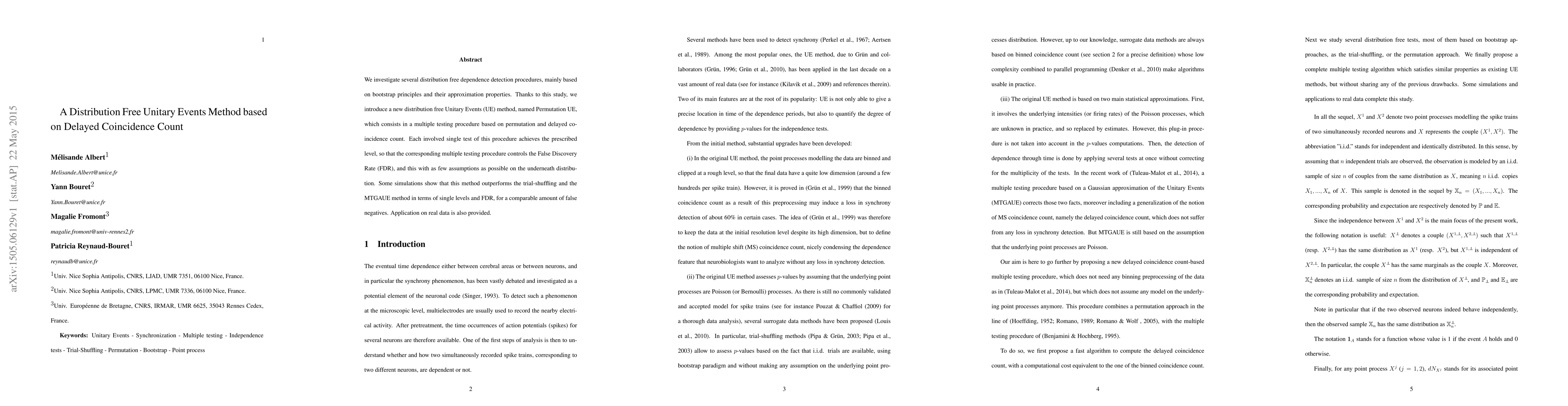 We investigate several distribution free dependence detection procedures, mainly based on bootstrap principles and their approximation properties. Thanks to this study, we introduce a new distribution free Unitary Events (UE) method, named Permutation UE, which consists in a multiple testing procedure based on permutation and delayed coincidence count. Each involved single test of this procedure achieves the prescribed level, so that the corresponding multiple testing procedure controls the False Discovery Rate (FDR), and this with as few assumptions as possible on the underneath distribution. Some simulations show that this method outperforms the trial-shuffling and the MTGAUE method in terms of single levels and FDR, for a comparable amount of false negatives. Application on real data is also provided.