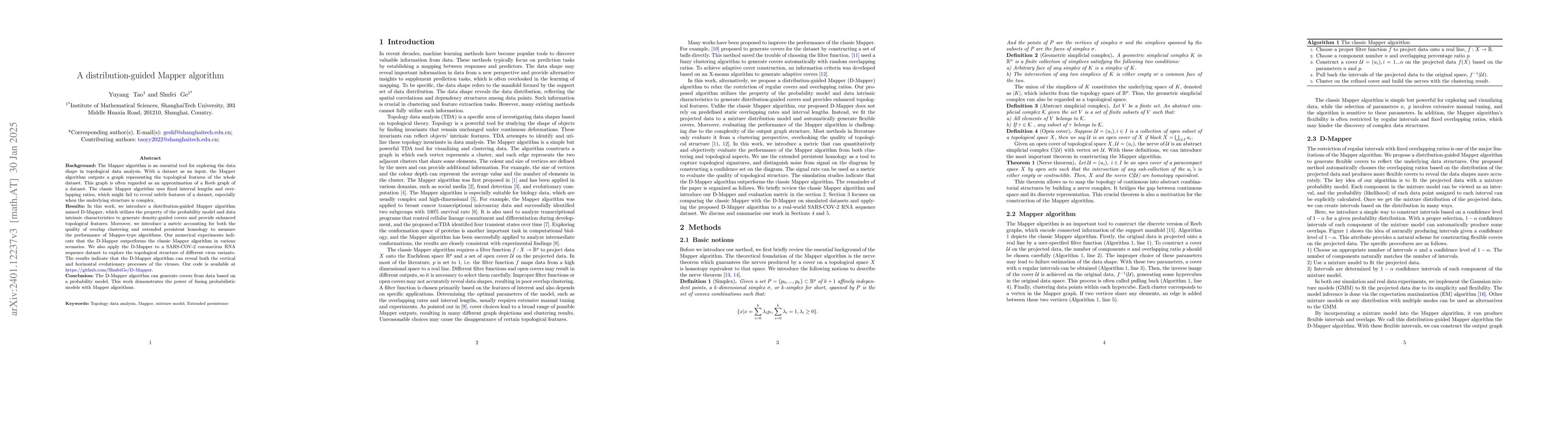 The paper proposes a new Mapper algorithm, D-Mapper, which uses distribution-guided covers to enhance topological feature extraction from complex datasets. The D-Mapper algorithm outperforms the classical Mapper in various scenarios and reveals evolutionary processes in SARS-COV-2 coronavirus RNA sequences.