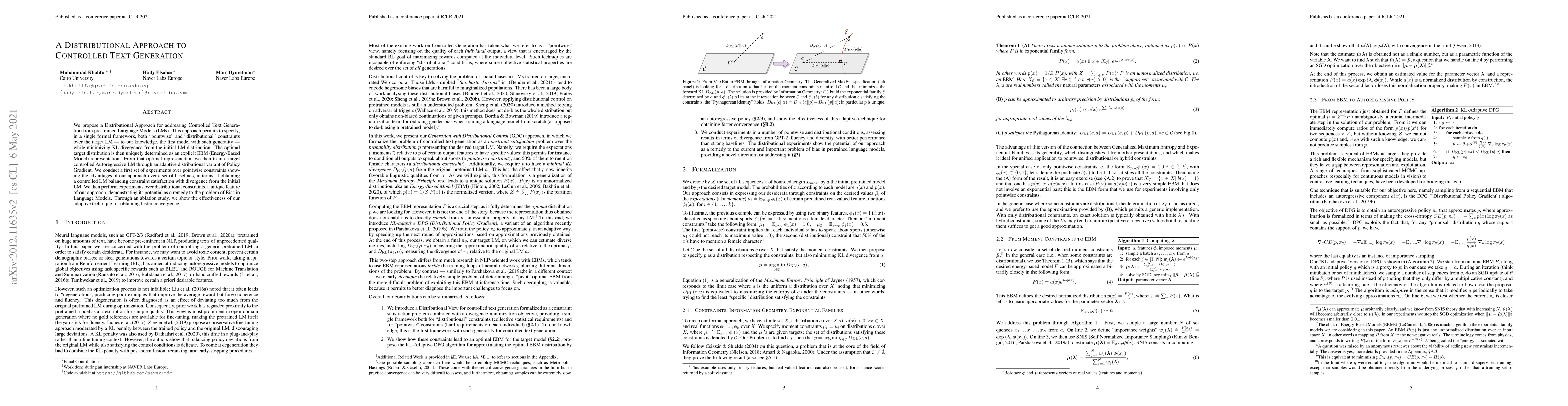 This paper introduces a novel Distributional Approach for Controlled Text Generation, enabling both "pointwise" and "distributional" constraints within a unified framework. The method leverages an Energy-Based Model to minimize divergence from the initial language model, achieving better balance between constraint satisfaction and original model fidelity.