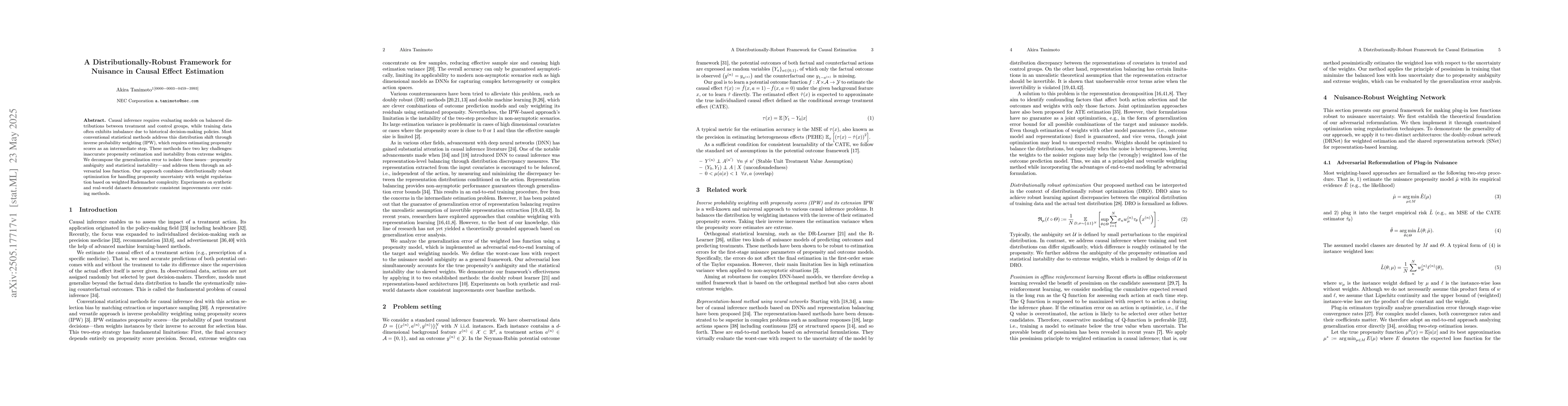 The research proposes a distributionally-robust framework addressing nuisance in causal effect estimation by decomposing generalization error into propensity ambiguity and statistical instability, then tackling these through adversarial loss and weight regularization techniques.
